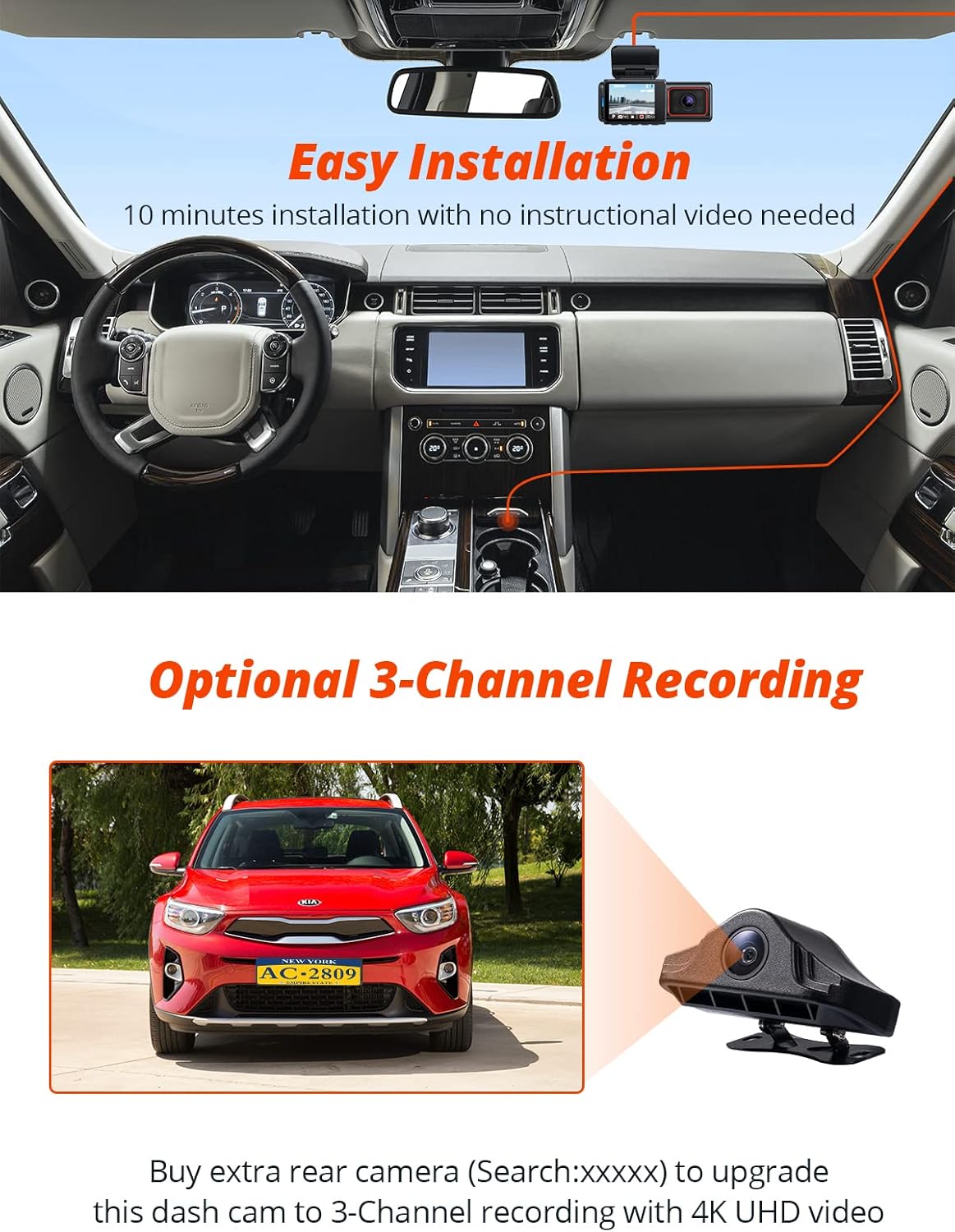 OPTIONAL 3 Channel Dash Cam – This D6 dual dash cam can be upgraded to 3 channel camera by separate purchase of the rear camera (Search: B0BLMPFNV3) . You can customize your camera to have a 2-way 4K+2K front and rear view, 4K+1080P front and inside view, or 3-way 2K+2K+1080P front, rear, and inside view according to your needs.