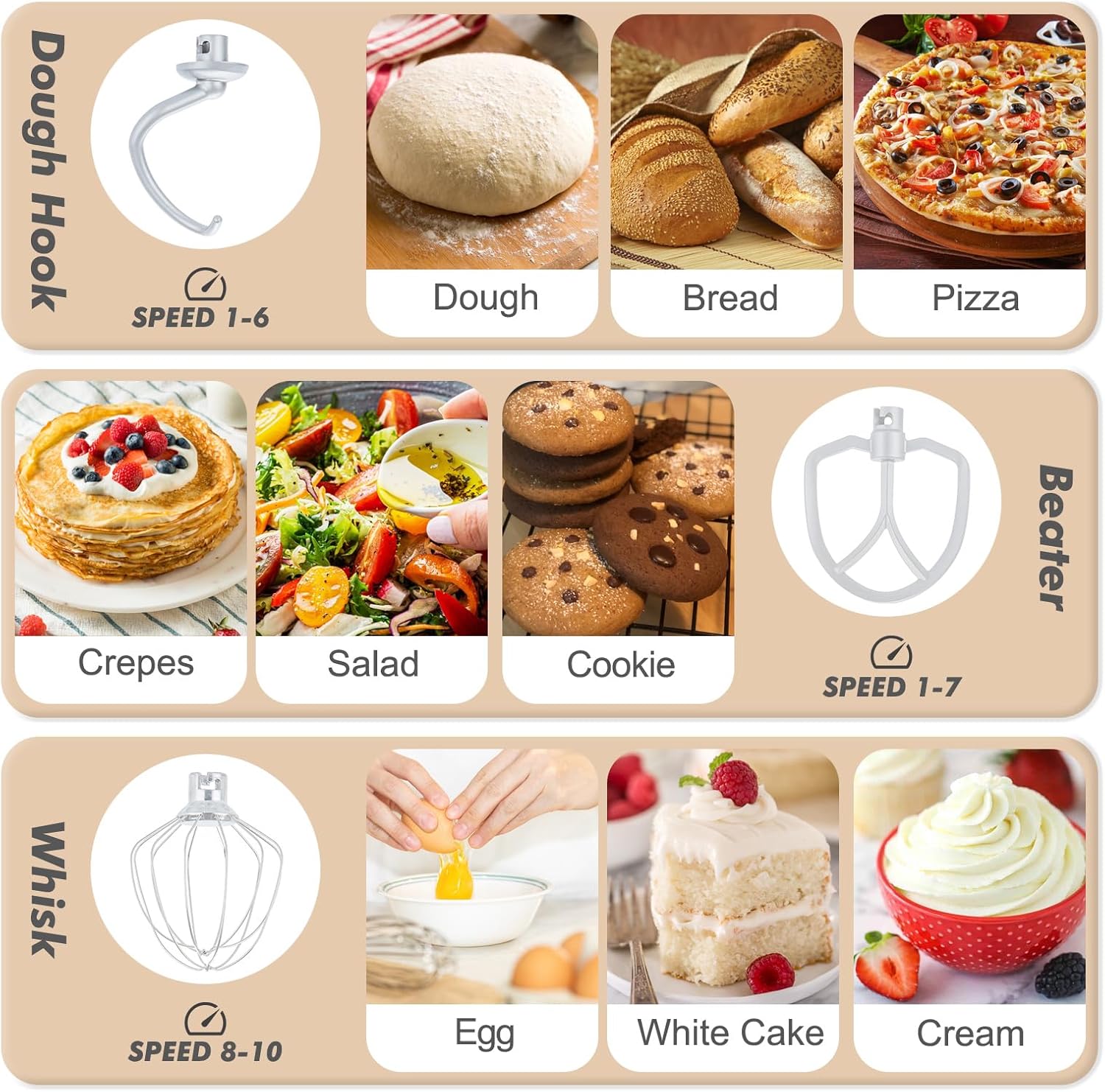 【Durable Attachments & Dishwasher Safe】As a versatile food mixer, it includes coated aluminum dough hooks & beaters, plus a stainless steel whisk for lasting performance. All attachments snap on and off in seconds for quick changes during baking. The stainless steel bowl and attachments are dishwasher safe (top rack recommended). This durable dough mixer from Kitchen in the Box simplifies kitchen cleanup.