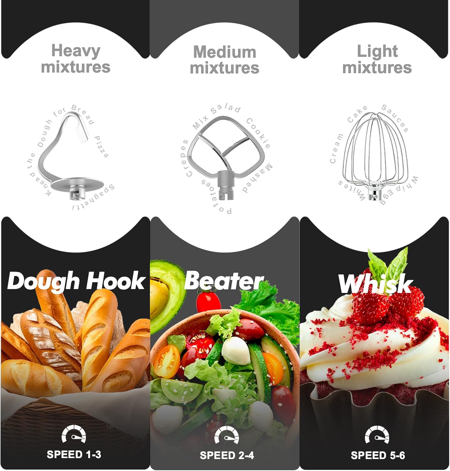 6.5QT Mixing Bowl with Handle: Our stand mixer has a 6.5QT stainless steel mixing bowl, which is ideal for mixing and cooking a variety of ingredients, sufficient capacity to make various types of bread; cookies; pizza; cream cakes and mix salads