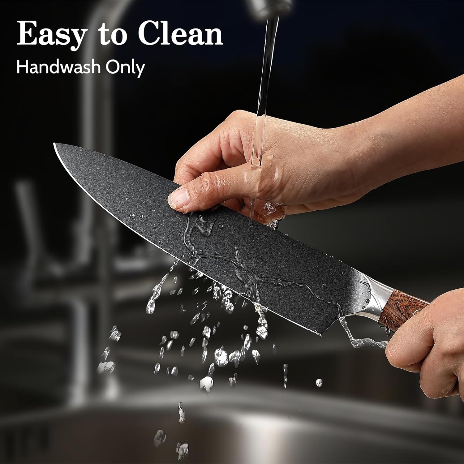 【Well-Balanced Kitchen Knife Set】The blades and handles of this set are perfectly balanced, allowing you to easily tackle everyday kitchen tasks like chopping, slicing, and dicing. The ergonomic wooden handle provides superior comfort, helping to minimize fatigue, numbness, or pain during use.