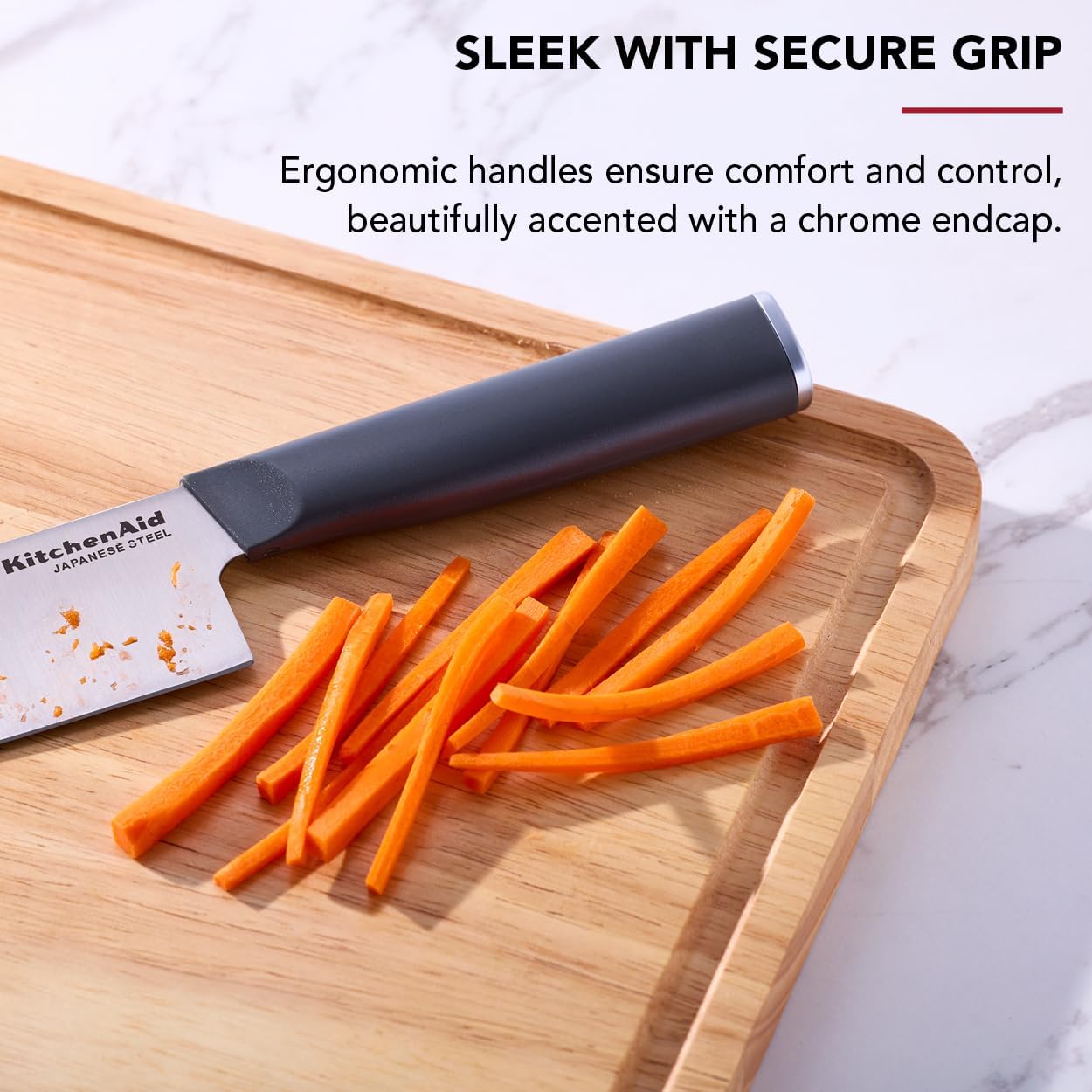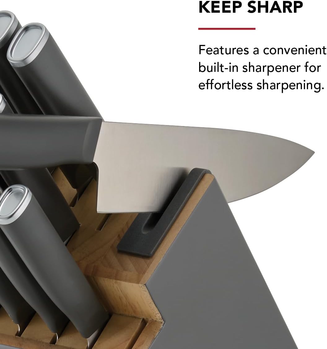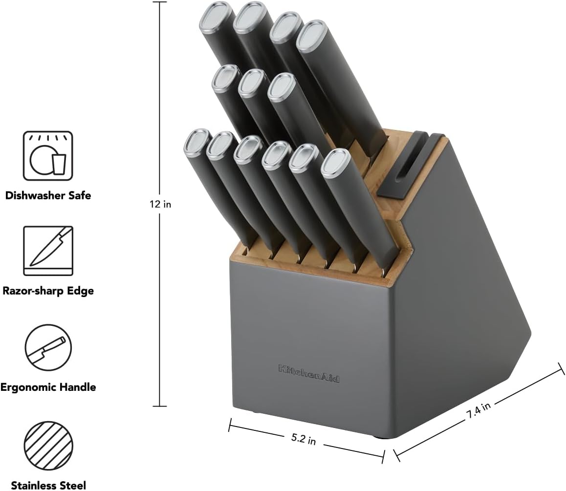 This KitchenAid 14-piece Knife Block Set with a built-in sharpener is a must-have for any culinary enthusiast or home chef. Housed in a contemporary two-tone wood block with a natural wood finish on top and a charcoal gray body, this perfect set includes an 8-inch chef knife, an 8-inch slicer knife, a 5.5-inch serrated utility knife, a 5-inch santoku knife, a 4.5-inch fine edge utility knife, a 3.5-inch paring knife, a 3.5-inch serrated paring knife, and six 4.5-inch steak knives. Crafted from semi-polished, high-carbon imported Japanese steel, these knives are hardened and tempered for a long-lasting edge, ensuring professional-quality cuts everyday. The Eastern-style ergonomic Charcoal Gray handles provide optimal control and comfort for everyday use and are accented with a stylish chrome endcap. While it keeps your knives sharp and ready for use with the built-in sharpener, ensuring precision cutting every time, this two-tone wood knife block set is a stylish addition to any kitchen. These KitchenAid knives are dishwasher safe on the top rack for convenient cleanup, though hand washing is recommended for extended longevity. Dry immediately for best results.