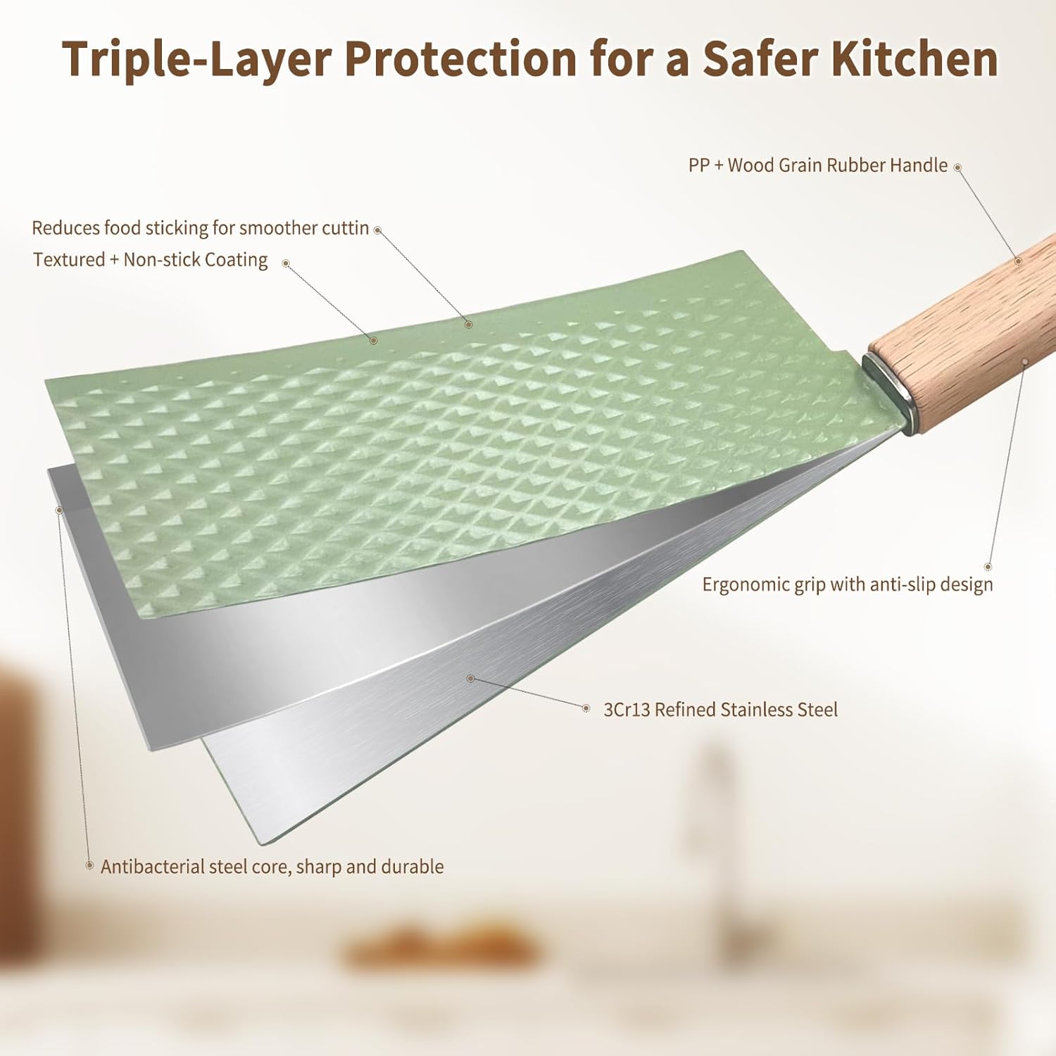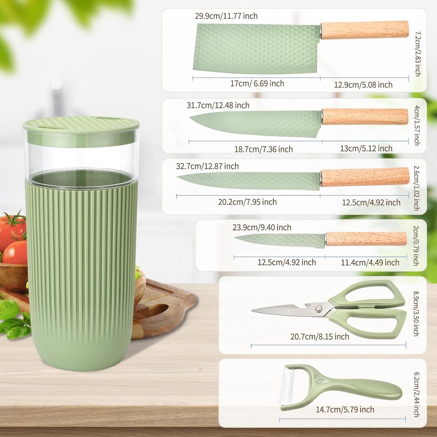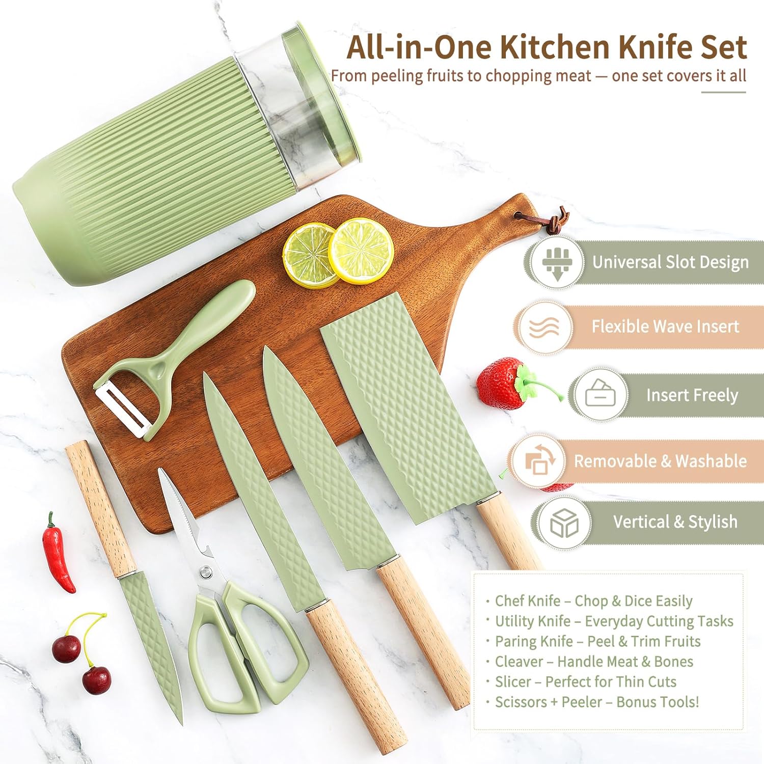 Freshen up your kitchen space with the TOPLUCKY 7-Piece Green Knife Set, where functionality meets modern nature-inspired design. Each tool in this collection features a high-carbon stainless steel blade with a non-stick diamond surface — perfect for precise, clean cuts every time. The earthy green knife handles bring warmth and character to your countertop, while the innovative clear-top knife block ensures both easy access and easy cleaning. The cleaver, chef knife, and slicer cover all your prep needs from herbs to meats. Whether you’re upgrading your kitchen setup or looking for a stylish gift, this green-toned set delivers premium performance with a refreshing look.