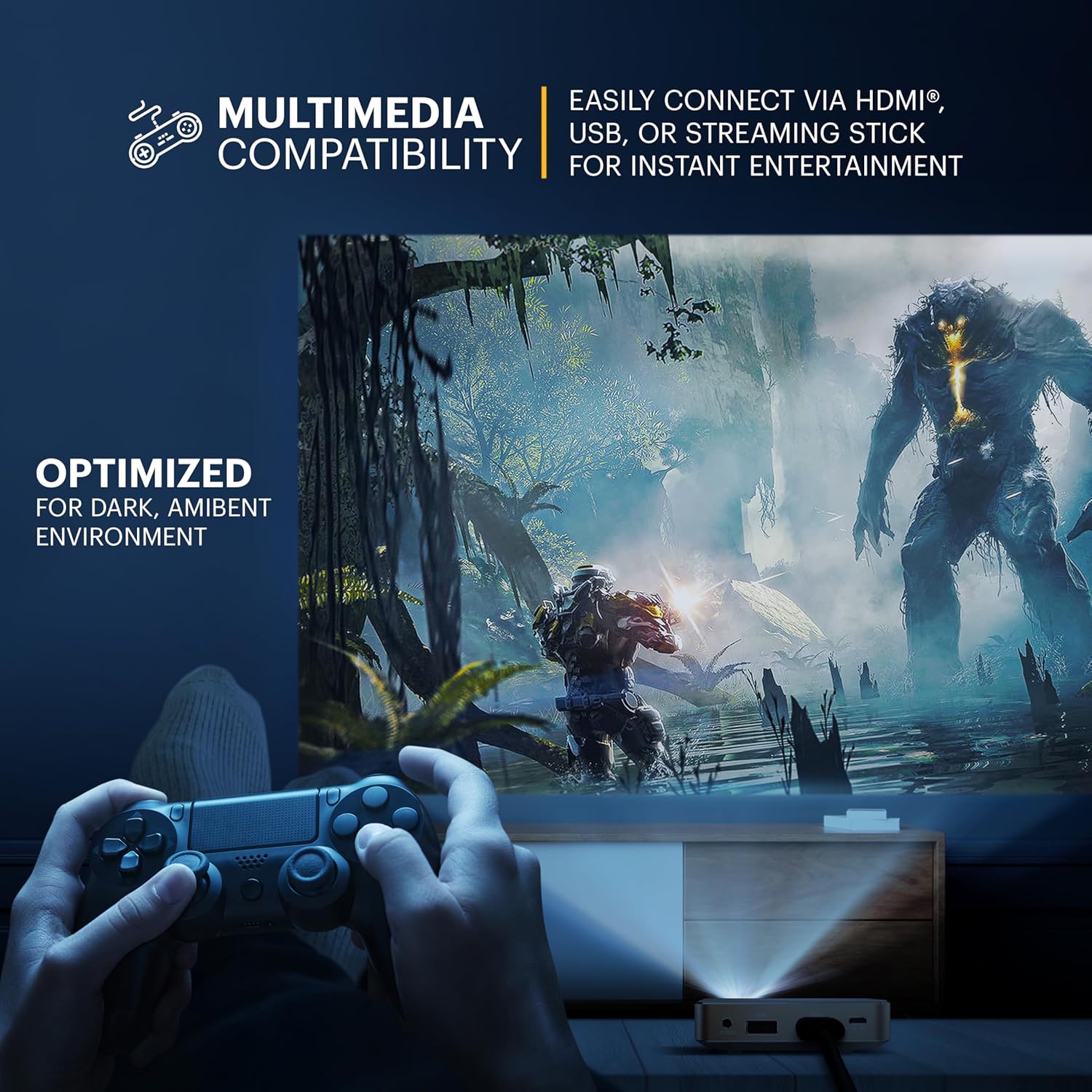 PLUG-AND-PLAY FROM ANY DEVICE – No Wi-Fi? No problem. The Luma 75 works anywhere with built-in ports for HDMI, USB, MicroSD, and 3.5mm audio. Easily connect your phone, laptop, camera, tablet, or game console for instant projection. Great for off-grid viewing, business use, or simple plug-and-play operation.