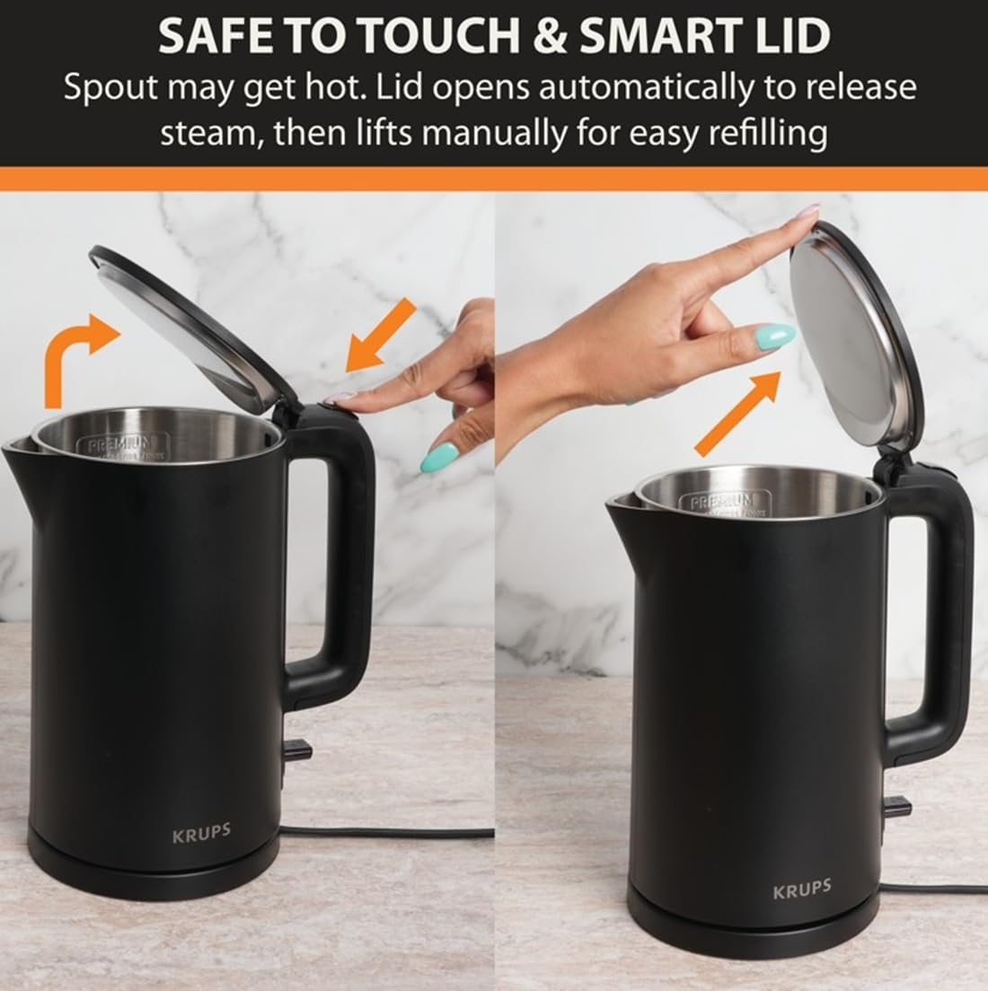 Enjoy total peace of mind with the Safe to touch Kettle water boiler by Krups. Ideal for the whole family, this cordless electric kettle with double-layer insulation keeps the water inside hot and the surface outside cool—meaning its always safe to touch! Discover a powerful kettle with a generous capacity, easy-to-clean design, and precision spout that promises drip-free pouring, and also functions as an electric tea kettle. For added convenience, the electric kettles for boiling water can be picked up or set down from any angle on its base.