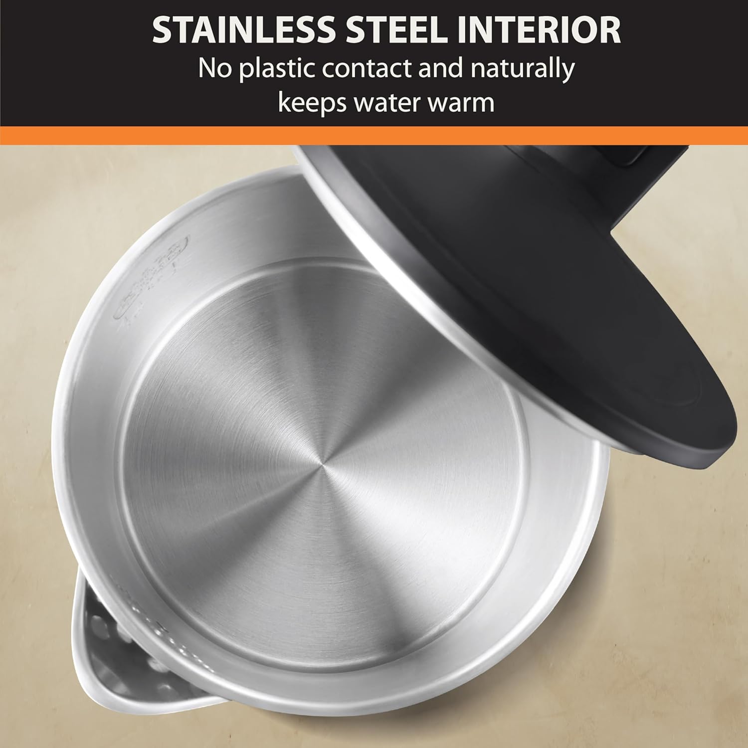 STAINLESS STEEL INTERIOR: The stainless steel electric kettle has no plastic contact and naturally keeps water warm.