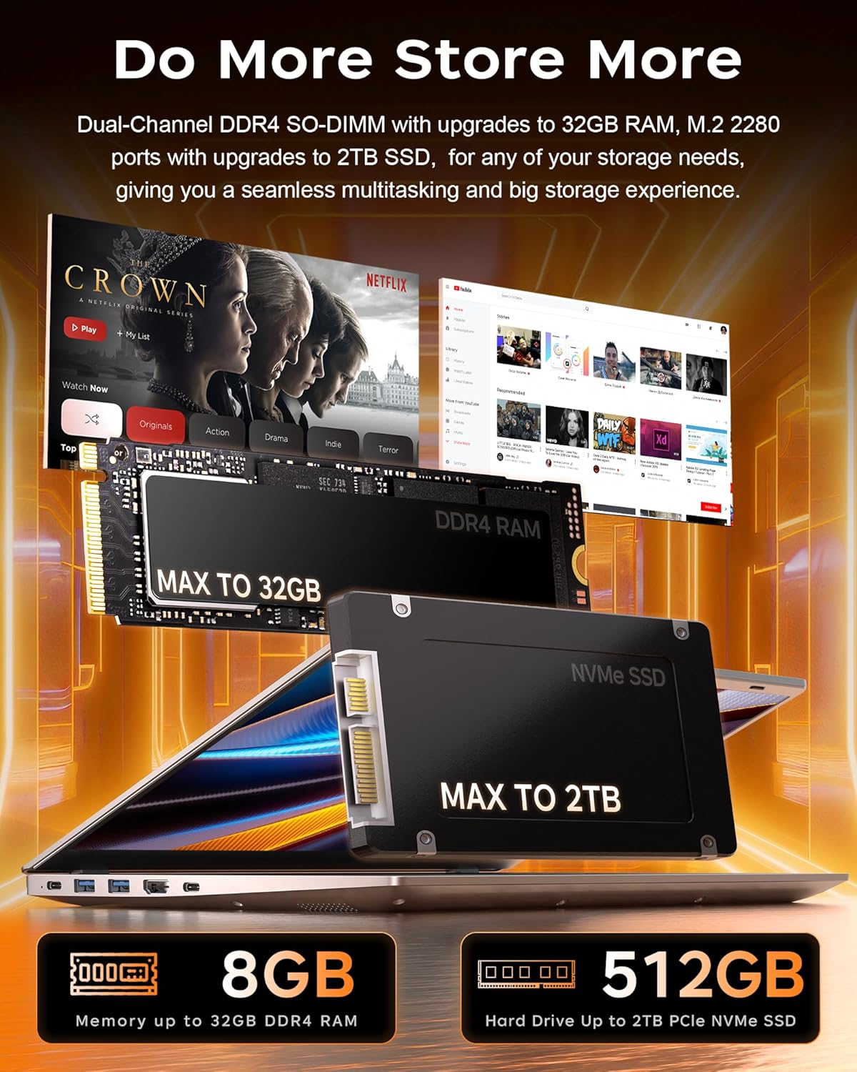 Next-Gen Speed & Storage: Equipped with 8GB RAM (Dual-Channel DDR4 – 3200MHz, Expandable up to 32GB) and 512GB M.2 SSD, this Laptop delivers lightning-fast responsiveness and ample storage for documents, apps, and media. Experience near-instant boot-ups, rapid file transfers, and effortless multitasking. Expand storage up to 2TB via the M.2 slot or TF card, ensuring you’re never limited by capacity.
