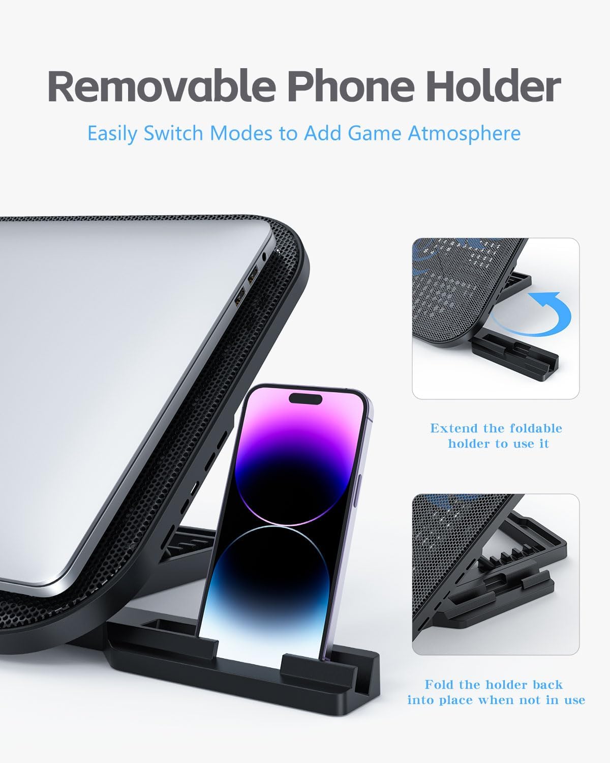【Durable Material】The body of this laptop fan cooling pad is made of durable ABS material, which is heat-resistant and wear-resistant, and the mask is made of mesh stainless steel. It is strong and provides very good heat dissipation performance. It is also equipped with a phone holder.