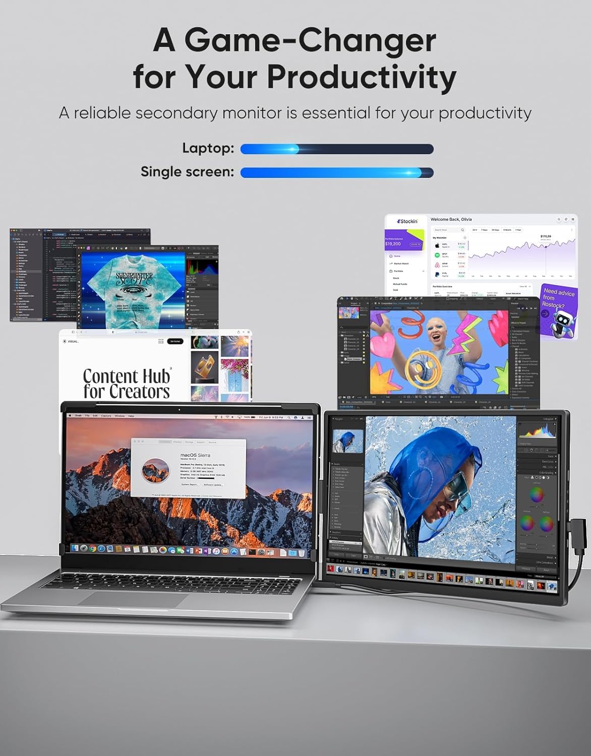 FHD 1200P IPS Screen Extender: With the 1920*1200 FHD IPS screens, 16:10 aspect ratio and 1000:1 contrast ratio, this laptop screen extender provides a crisp, clear graphic view with sharp and vibrant visuals that is perfect for multitasking