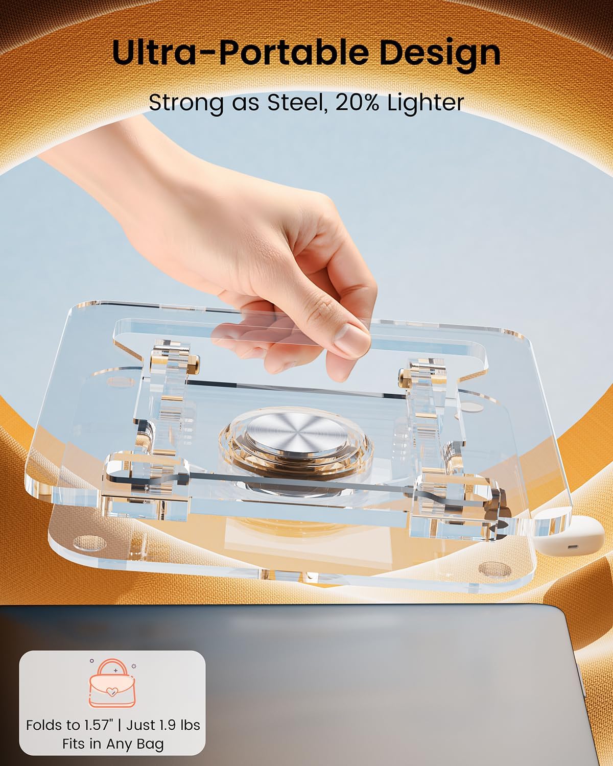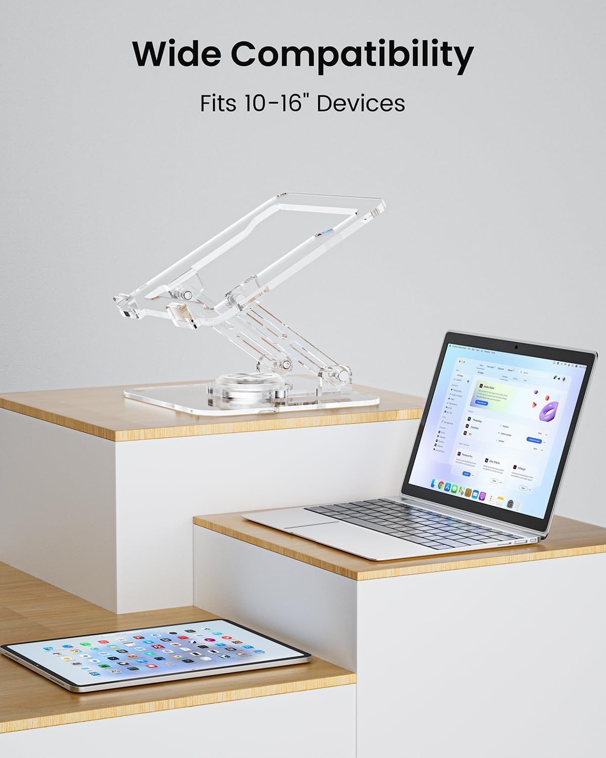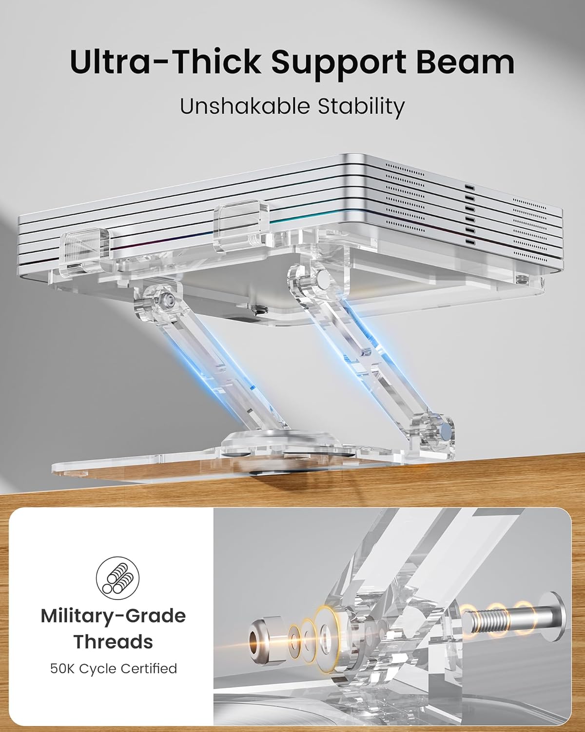 【 Premium Clear Acrylic Build 】— Made from sturdy Class-A acrylic, this clear laptop stand adds a modern, minimalist style to your workspace while keeping stability and durability.