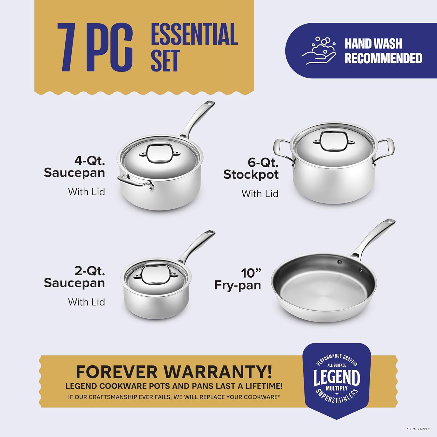 LEGEND COOKWARE 5-Ply Stainless Steel Cookware Set | 7-Piece Pot and Pan Set | Induction Compatible, Non-Toxic | Heavy Duty 18/8 Full Clad Construction | Oven Safe Even Heating | PFOA PTFE PFOS Free