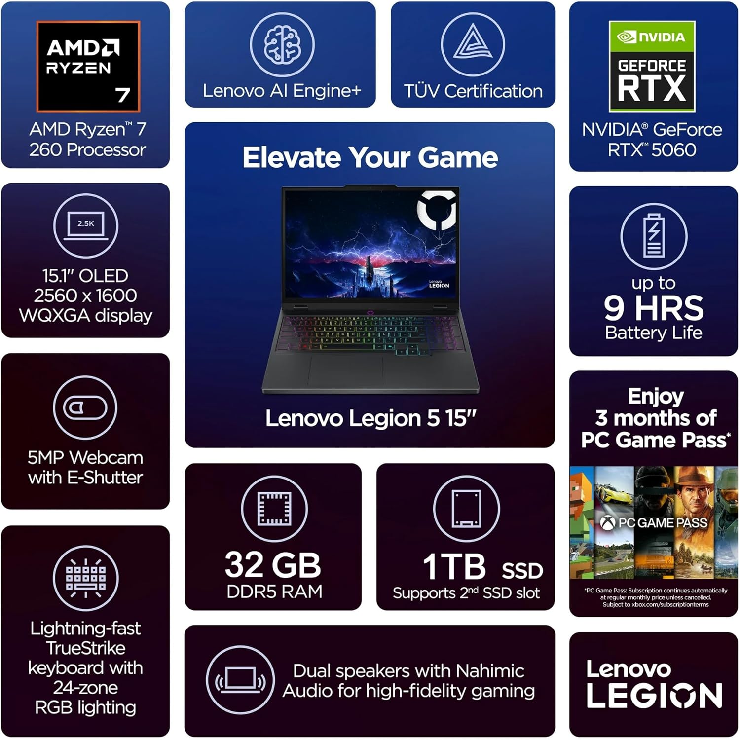 Lenovo Legion 5 15.1″ OLED WQXGA 165HZ Gaming Notebook, AMD Ryzen 7 260 32GB RAM 1TB SSD, NVIDIA GeForce RTX 5060, Win11 Pro & Office Lifetime License, Eclipse Black + 2TB Flash Drive, W/GaLiMu