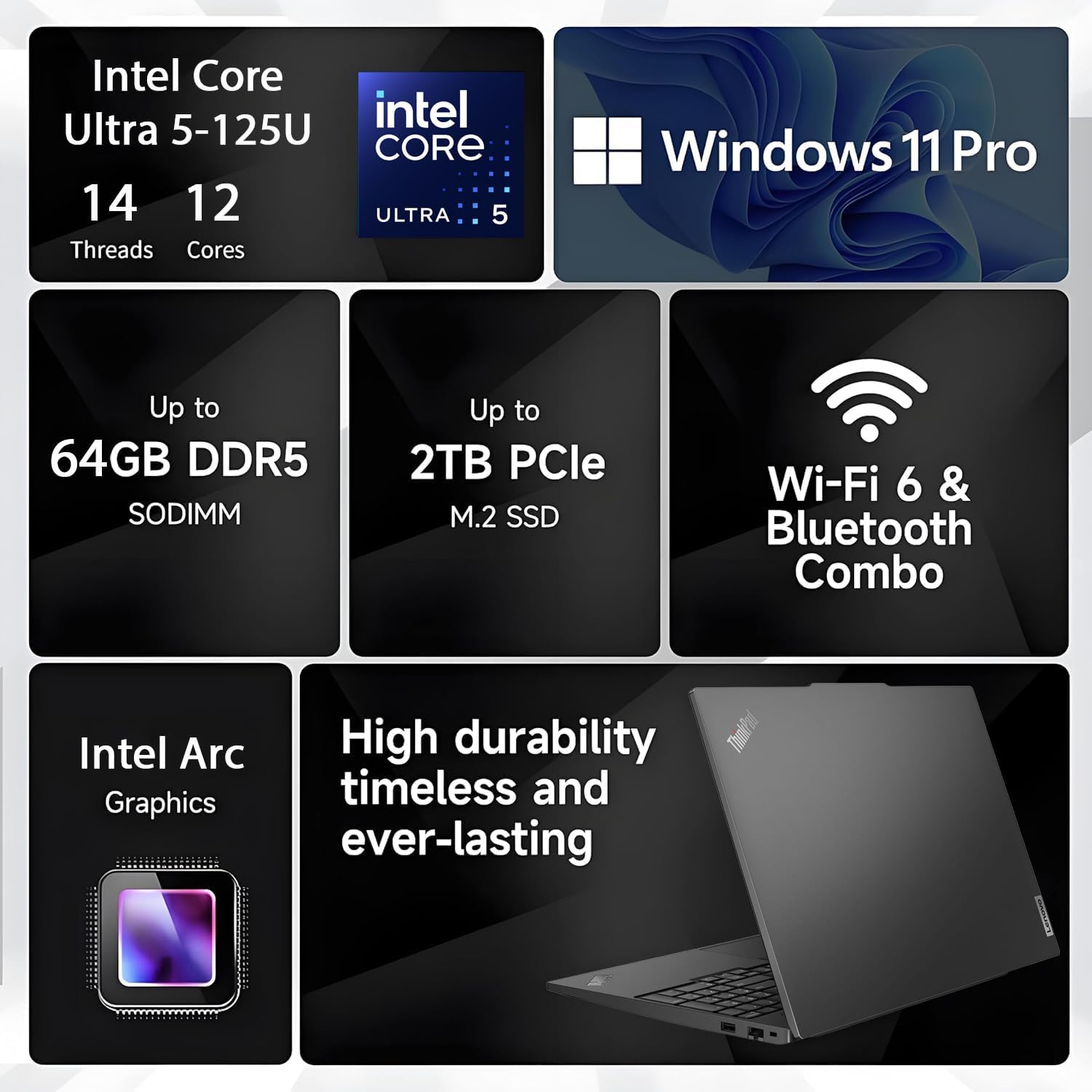 Accessories: Microsoft Office; WOWPC Recovery USB Processor: Intel Core Ultra 5 125U, 12C (2P + 8E + 2LPE) / 14T, P-core up to 4.3 GHz, E-core up to 3.6 GHz, 12MB Cache Graphics: Integrated Intel Graphics (Xe architecture) Operating system: Windows 11 Pro 64-bit Memory: Up to 64GB DDR5-5600 RAM Hard Drive: Up tp 2TB SSD M.2 PCIe 4.0 NVMe Display: 16″ WUXGA (1920 × 1200) IPS, 300nits, Anti-glare, 45% NTSC, 90% screen-to-body ratio Connectivity: Wi-Fi 6E (802.11ax) + Bluetooth 5.3 Ports: 1 × USB 3.2 Gen 1, 1 × USB 3.2 Gen 1 (Always On), 1 × USB-C 3.2 Gen 2 (Data + PD 3.0 + DP 1.4), 1 × Thunderbolt 4 / USB4 (40Gbps, Data + PD 3.0 + DP 1.4), 1 × HDMI 2.1 (up to 4K/60Hz), 1 × Ethernet (RJ-45), 1 × Headphone/Microphone Combo Jack, 1 × SD Card Reader Built-in Speakers: Stereo speakers, 2W ×2, Dolby Audio Keyboard: Backlit, US English, with Numeric Keypad + TrackPoint, Fingerprint Reader Built-in Webcam: FHD 1080p Camera with Privacy Shutter, Dual Microphones Color: Graphite Black (Aluminium Top, PC-ABS Bottom, Anodized Sandblasting) Dimensions (L × W × H): 14.25 × 10.3 × 0.78 inches (362 × 262 × 19.9 mm) Weight: 3.9 lbs (1.78 kg) Battery: 57Wh, 65W USB-C Power Adapter
