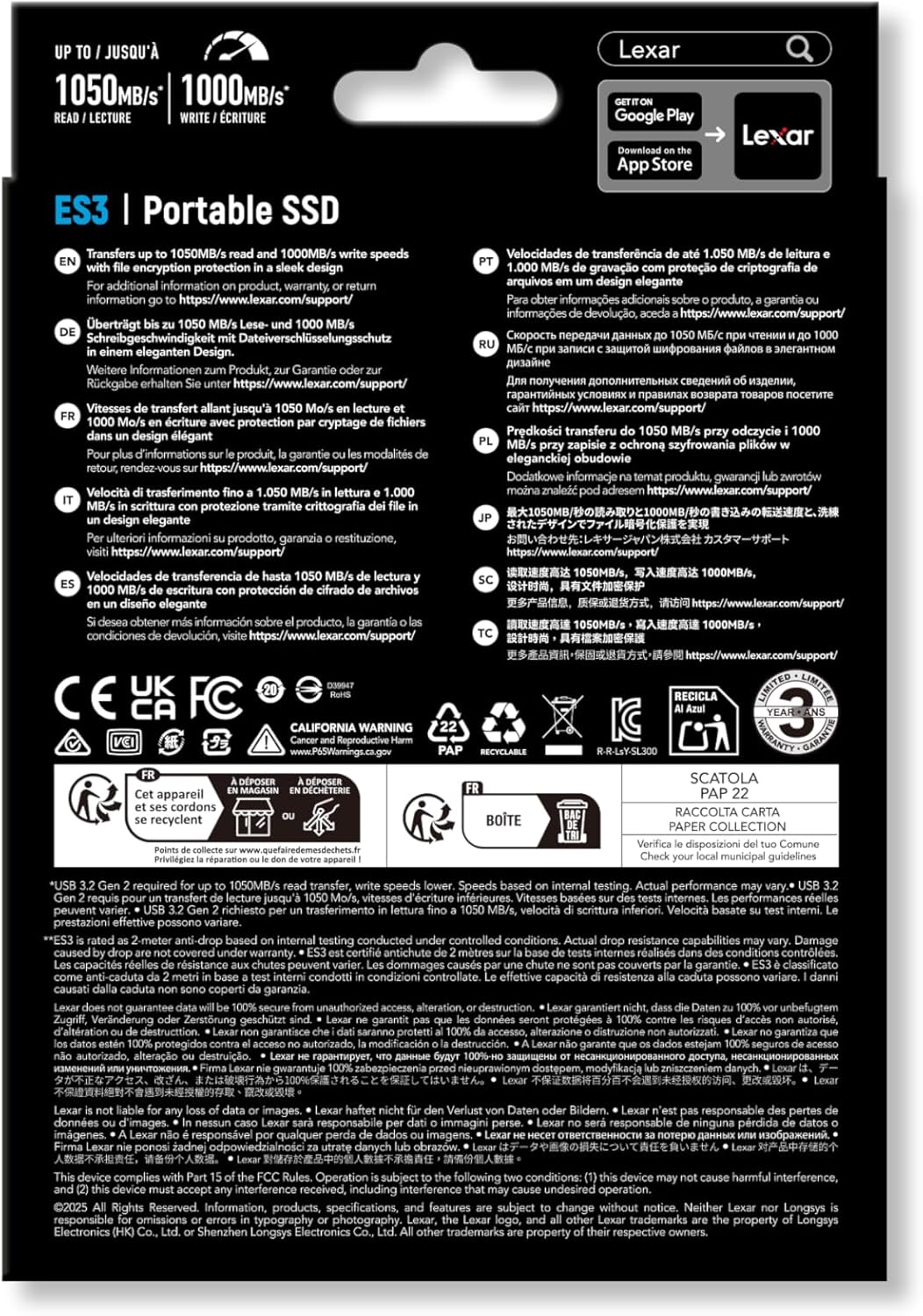(2) The Lexar ES3 Portable SSD is rated 2-meter anti-drop based on internal testing conducted under controlled conditions. Actual water, dust, and drop resistance capabilities may vary.Lexar is not liable for any loss of data or images.Actual usable memory capacity may vary. 1GB equals 1 billion bytes.