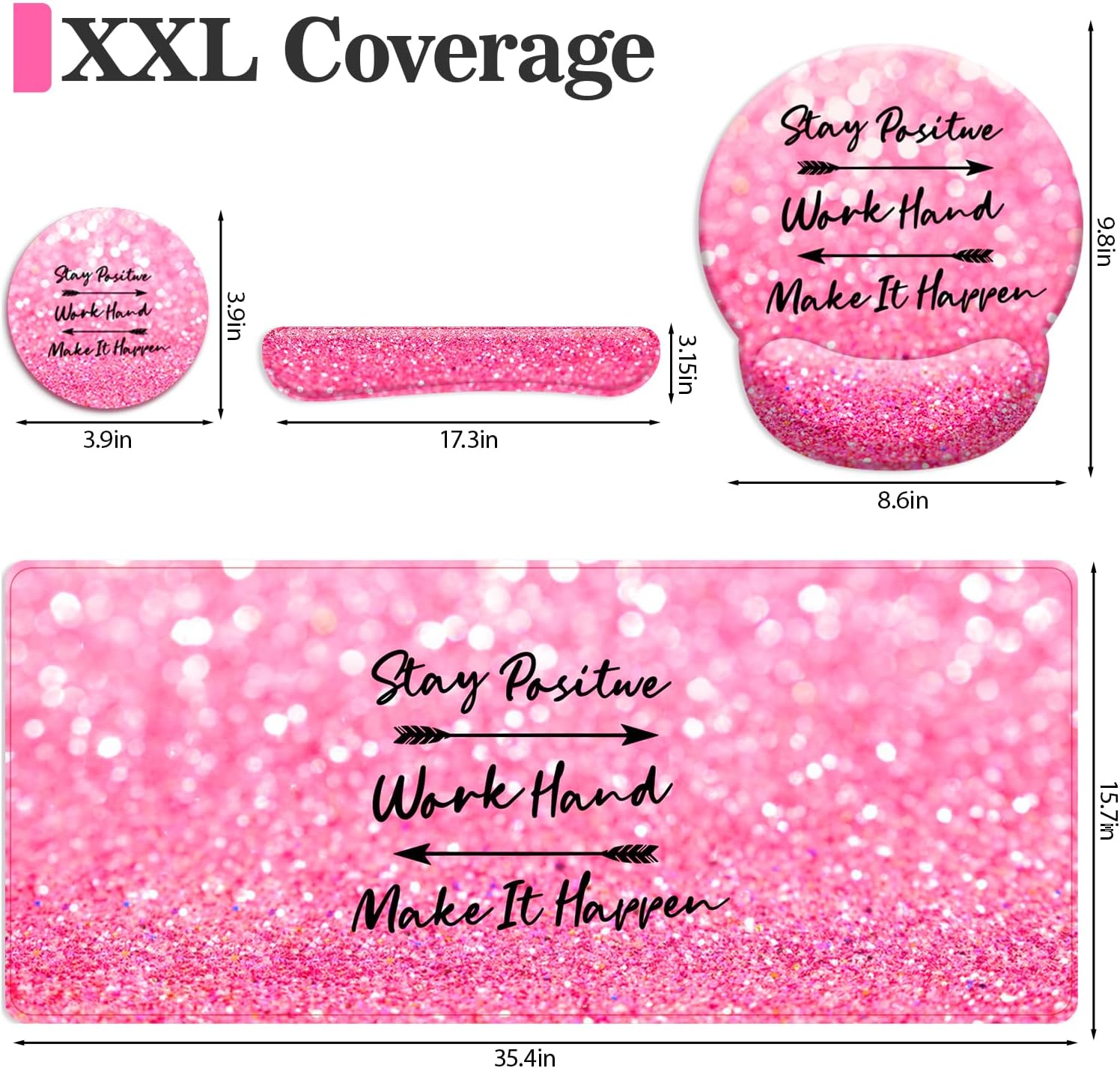 Premium Workspace Coverage: Large mouse pad 35.4×15.7 and desk pad mat 17.32×3.15,computer mat 8.66×9.84 creates ultimate desk ecosystem.Keyboard pad with cloud wrist rest fits full sized keyboards.Pink desk accessories blend seamlessly with pink office supplies for cohesive workstation aesthetics
