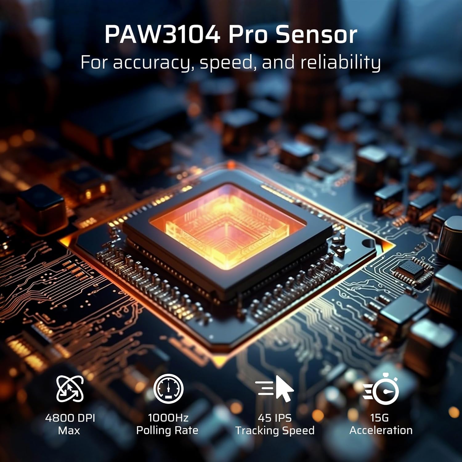 Reliable PAW3104 Sensor — Equipped with a PAW3104 sensor, LTC GM023 mouse delivers precision with 1000Hz polling rate, 15G acceleration, and 45 IPS tracking speed. Choose from 6 DPI settings (up to 4800 DPI) for optimal control.