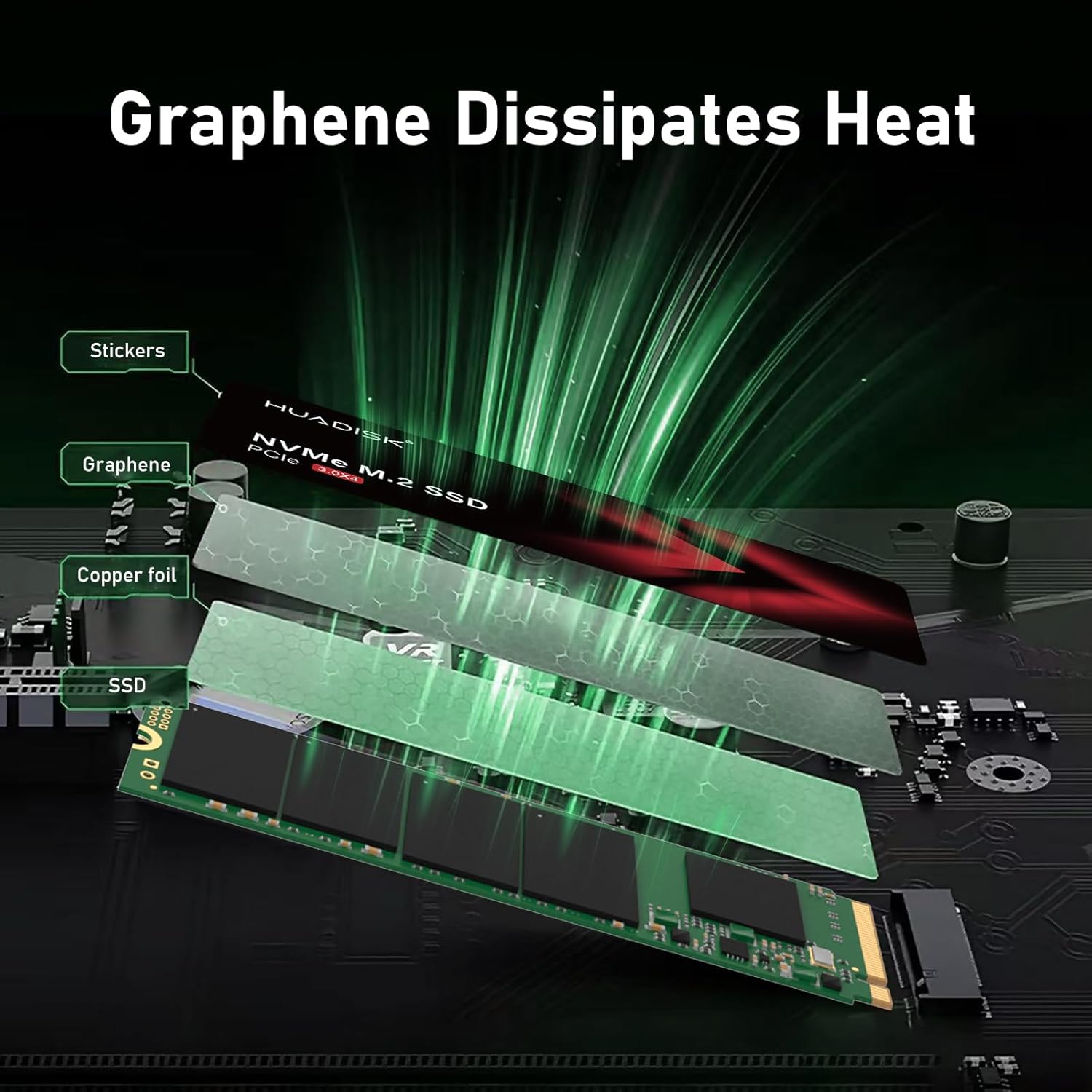 SSD Graphene Cool: Huadisk NVMe M.2 2280 ssd has graphene layers for heat dissipation. Graphene, cuts the internal ssd temp by up to 10°C (±), avoiding overheating in heavy tasks like transfers, 4K editing, gaming for stable, long-lasting use