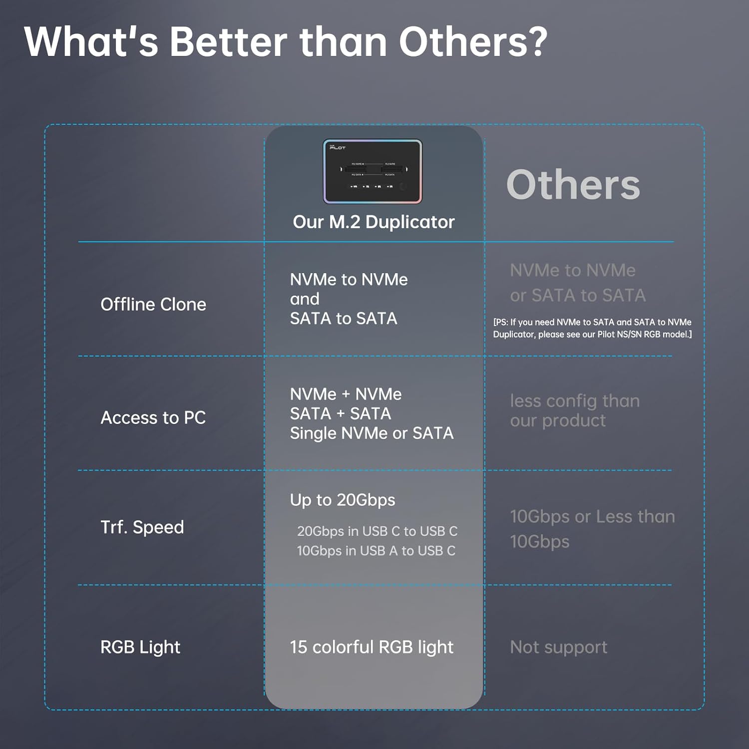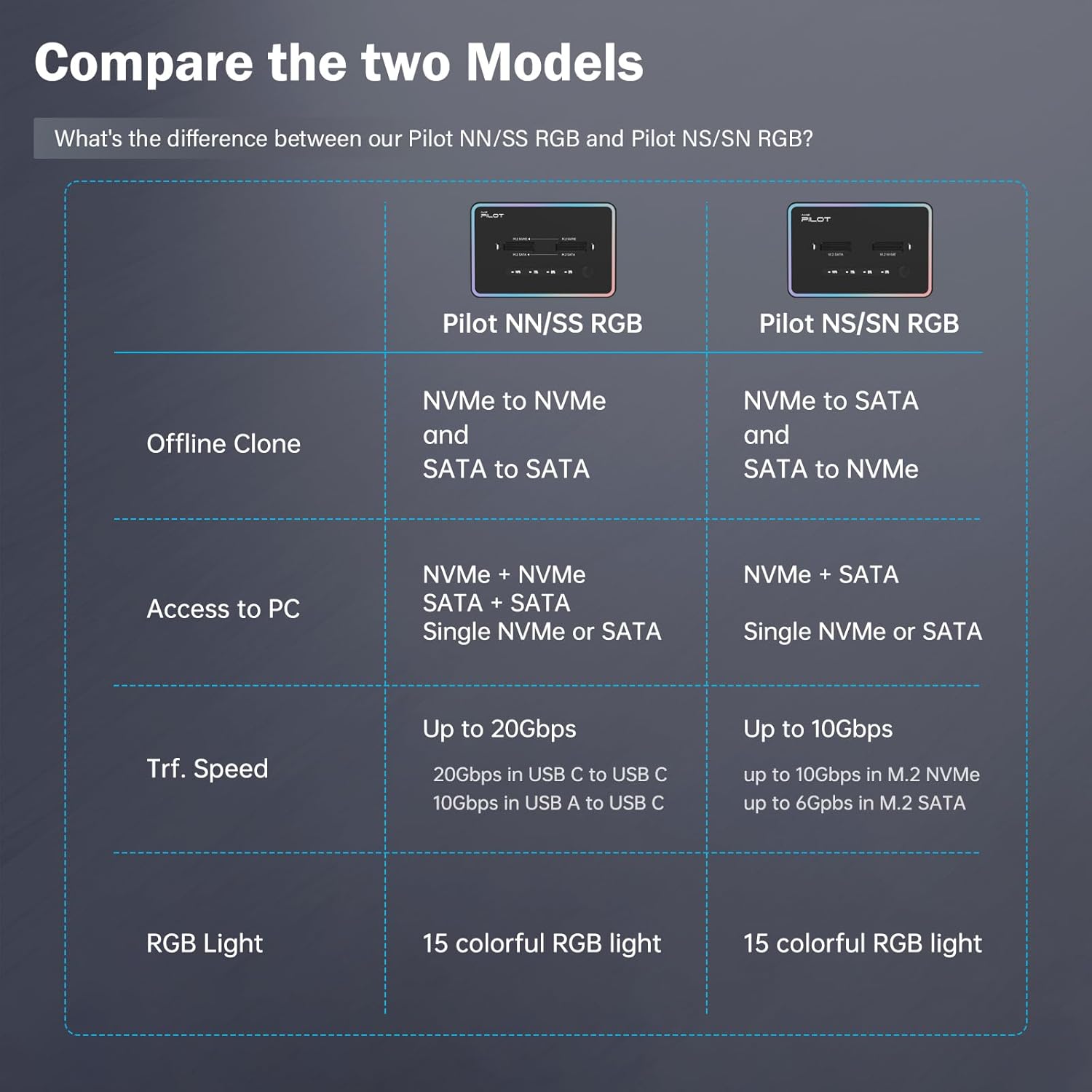 [One Button Offline Clone]: M.2 duplicator, just press and hold the Offline Clone button for 5 seconds to start NVMe to NVME or SATA to SATA duplicator. All various files, formats can be easily offline cloning in a few minutes by dual bay SSD cloner without connecting computer, NVMe cloner requires connect the power adapter. Ideas for computer operation, maintenance, etc.(Note: 1> Pilot NN/SS RGB does not support NVMe to SATA or SATA to NVMe copies, if you need NVMe to SATA or SATA to NVMe duplicator, please see our other model: Pilot NS/SN RGB. 2> The actual capacity target≥source)