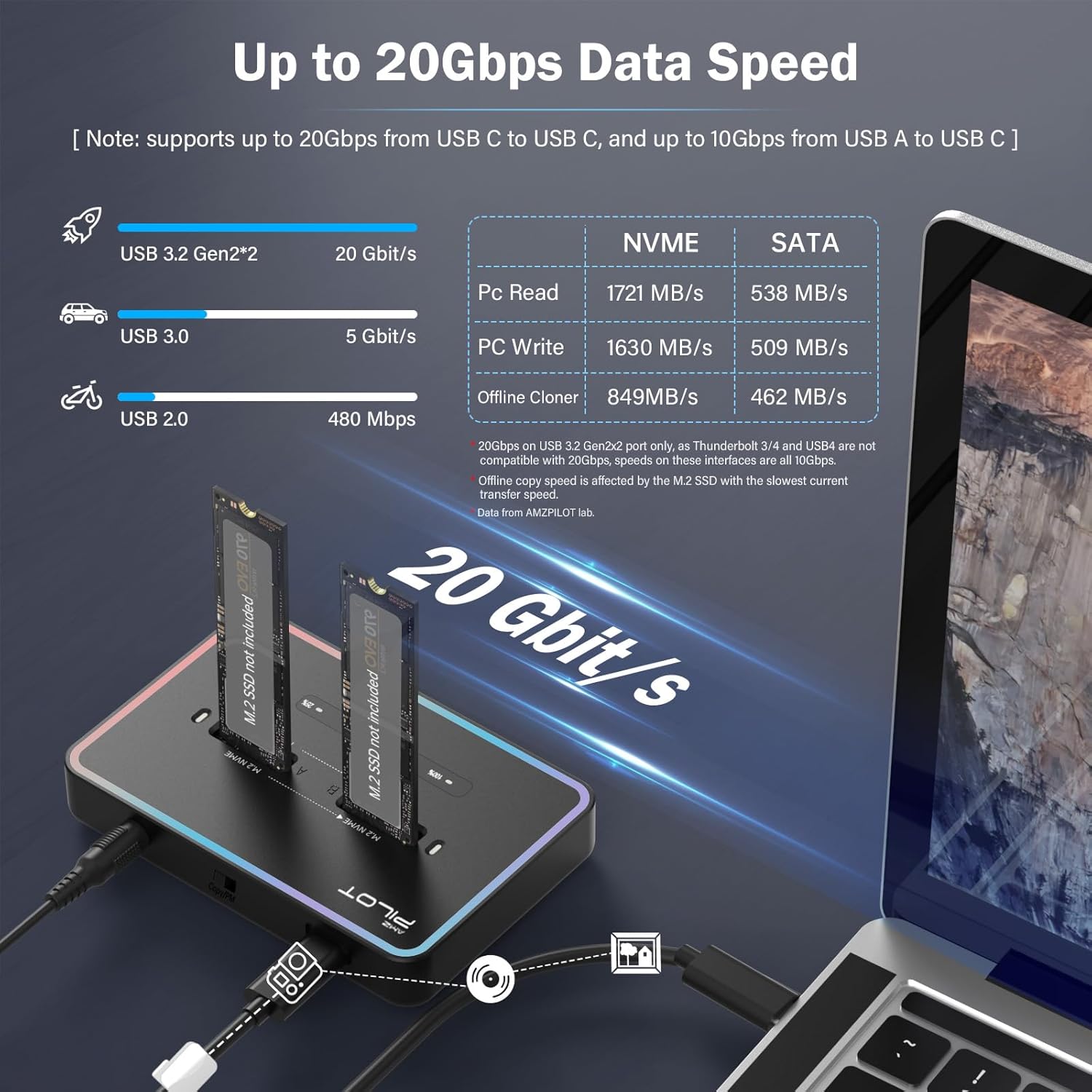 [20Gbps Extreme Speed]: Advanced chipset M.2 cloner nvme duplicator to USB C docking station. Up to 20Gbps high speed M2 NVMe / PCIE in USB C to USC C cable, 6Gbps high speed M2 SATA3 (SATA ⅲ) / NGFF over USB 3.2 Gen 2*2, NVMe to USB perfect solution for data transfer and backup. HD movie transfer takes only 2-5 seconds. In addition, SSD to USB adapter with an 2 in 1 USB A/C to USB C data cable to connect more devices.