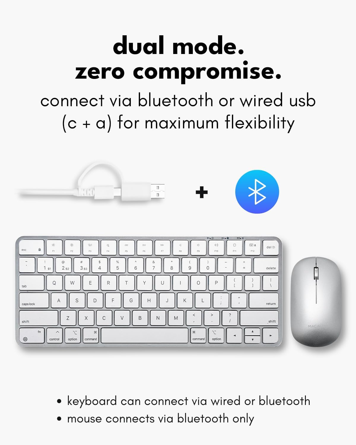 Dual Mode for Flexible Use: Enjoy a mac mini keyboard and mouse that connects via Bluetooth for a wireless workspace or plugs in with the included USB C + USB A cable for instant, reliable performance.
