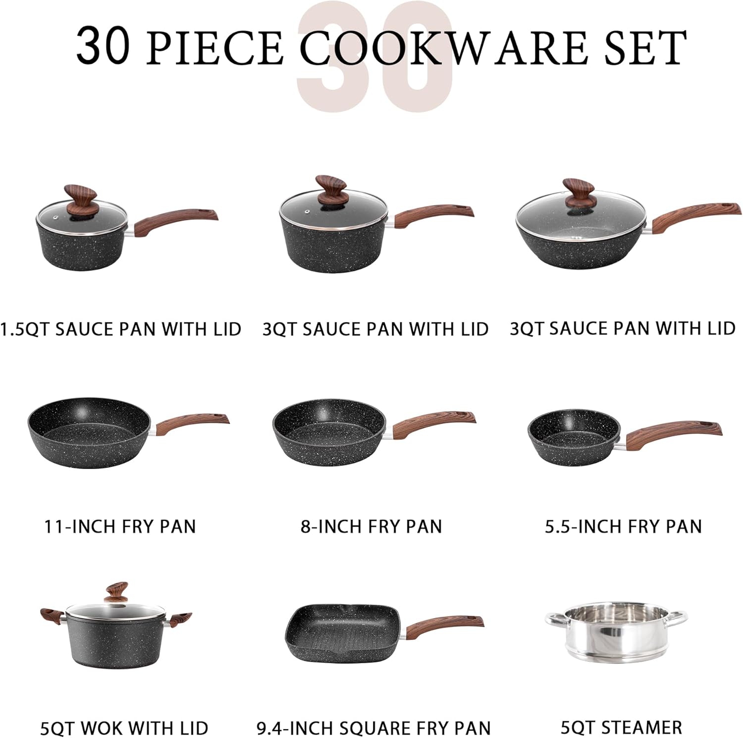 MAISON ARTS 30 Piece Pots and Pans Set Non Stick, Kitchen Cookware & Bakeware Sets with Nonstick Granite Coating, Baking Tray, Frying Pan and Saucepan, Black