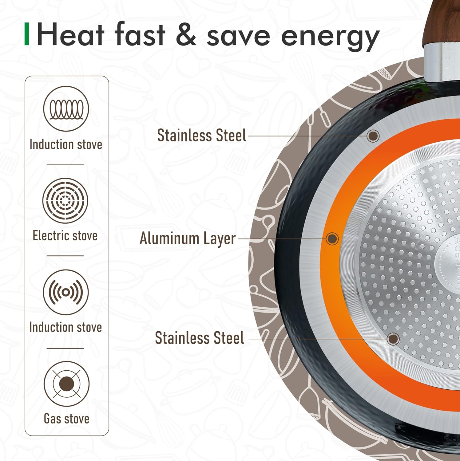 Wooden Handles and Tempered Glass Lids: The pots and pans come with wooden handles that provide a comfortable and secure grip while cooking. The tempered glass lids allow you to monitor your food without losing heat or moisture
