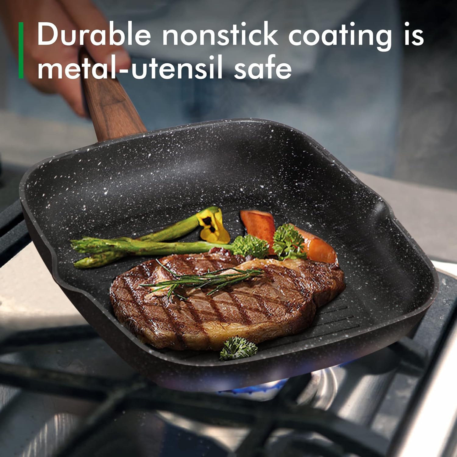Nonstick Coating: The cookware set features a nonstick design, which prevents food from sticking to the pots and pans and makes cleaning up a breeze. This design makes cooking easier and more convenient