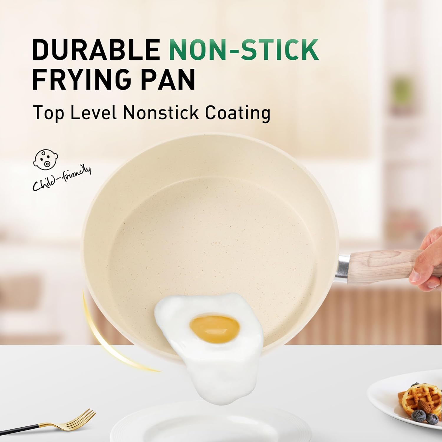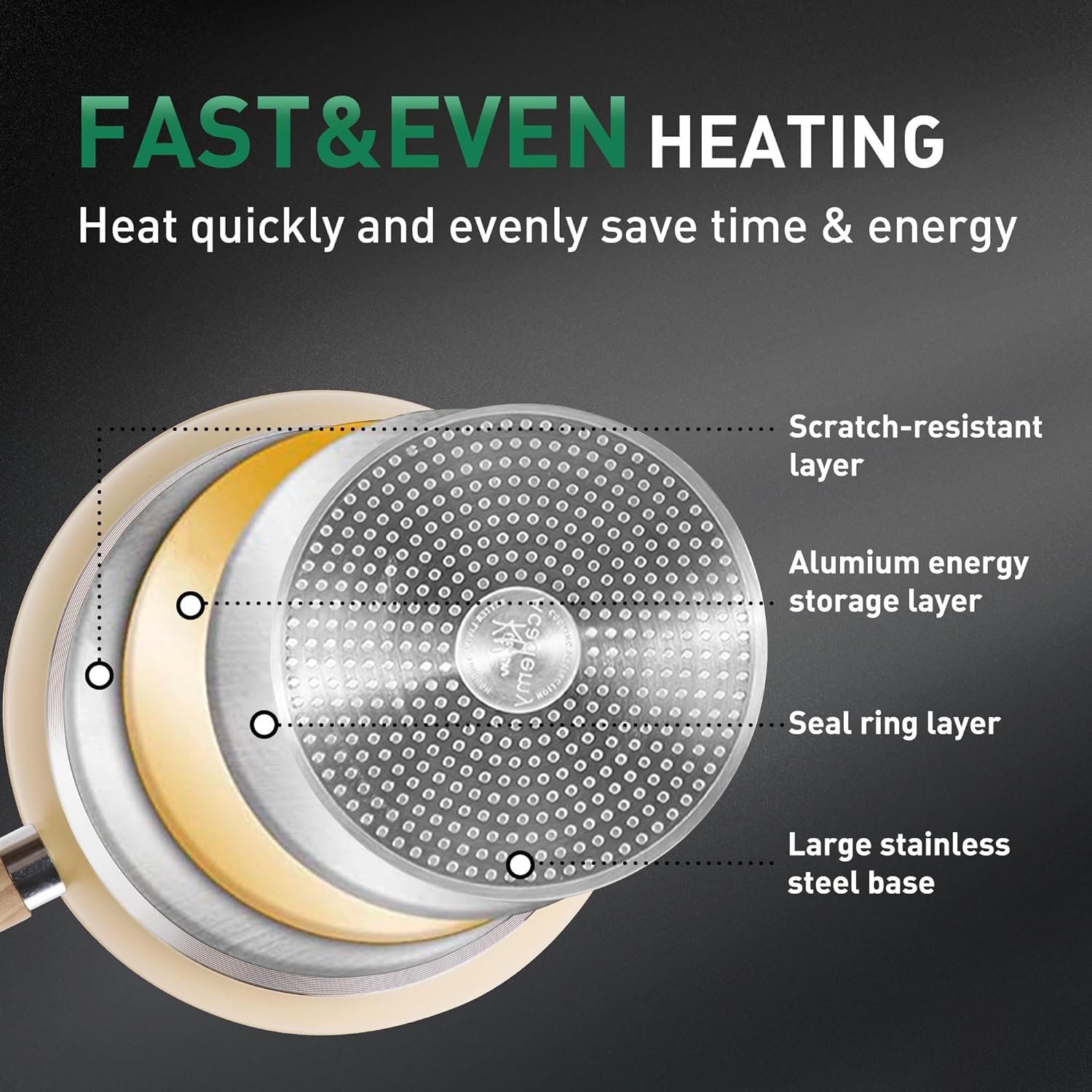 Heats Quickly & Evenly: This cookware uses professional grade aluminum core that conducts heat quickly and evenly with precise temperature control, which will save time and energy. This induction frying pan set can adopts various cooking methods to make delicious food to satisfy your stomach