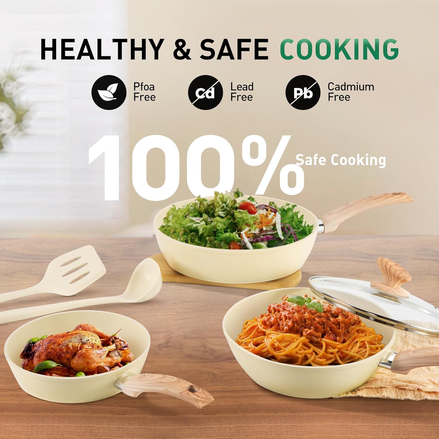 Healthy Non-Stick Granite Coating: Our pan set interior & exterior is coated by high performance non-stick granite coating, which makes the nonstick skillet easy to cook and clean. It means minimum oil or butter useing for healthy diet cooking and easier do a better cooking