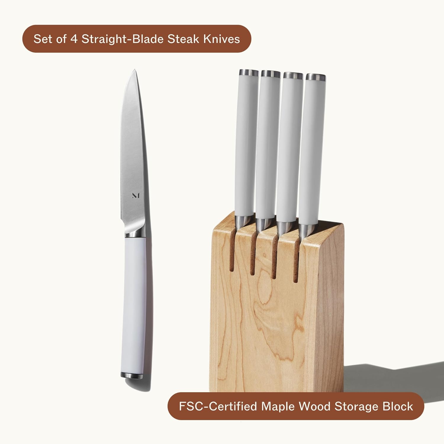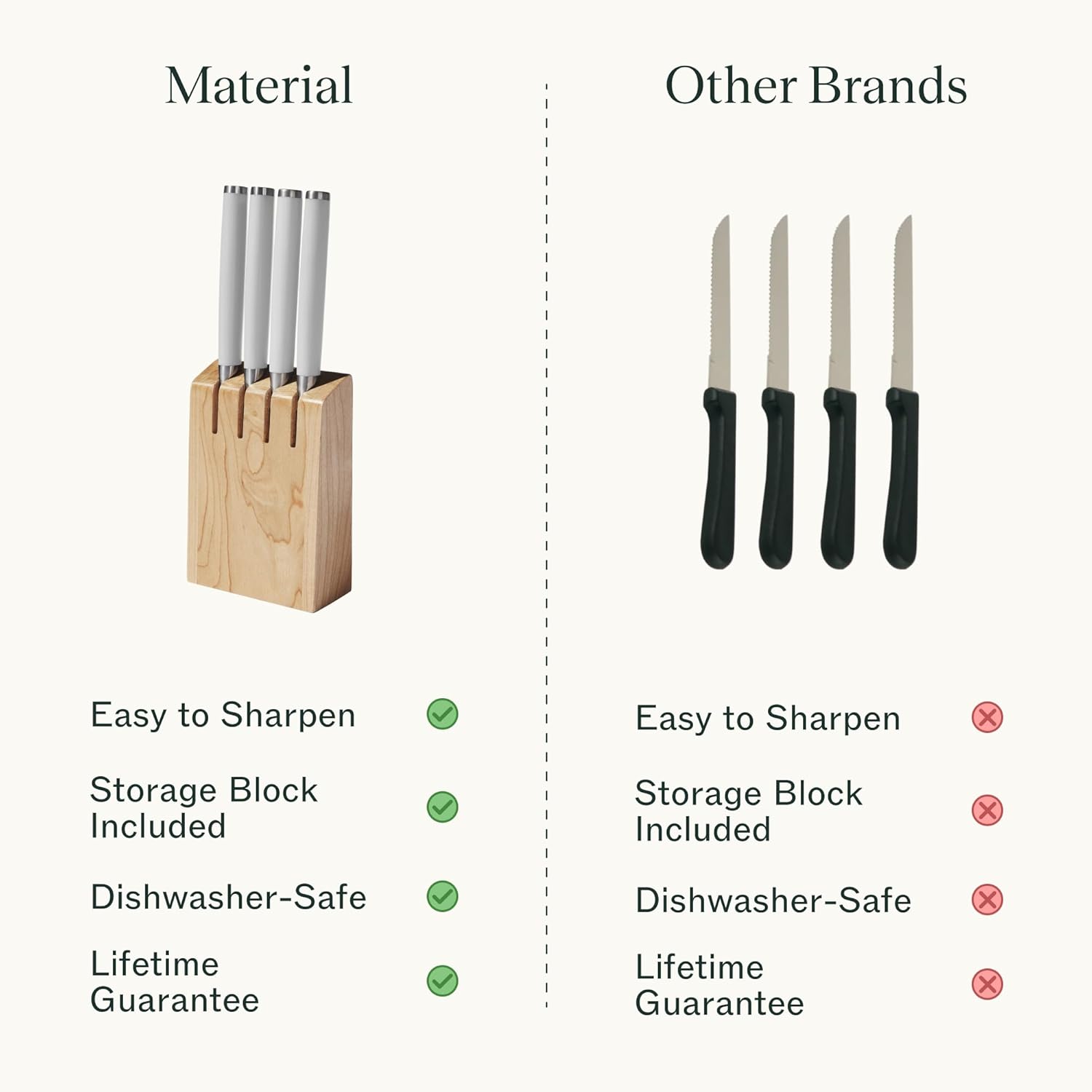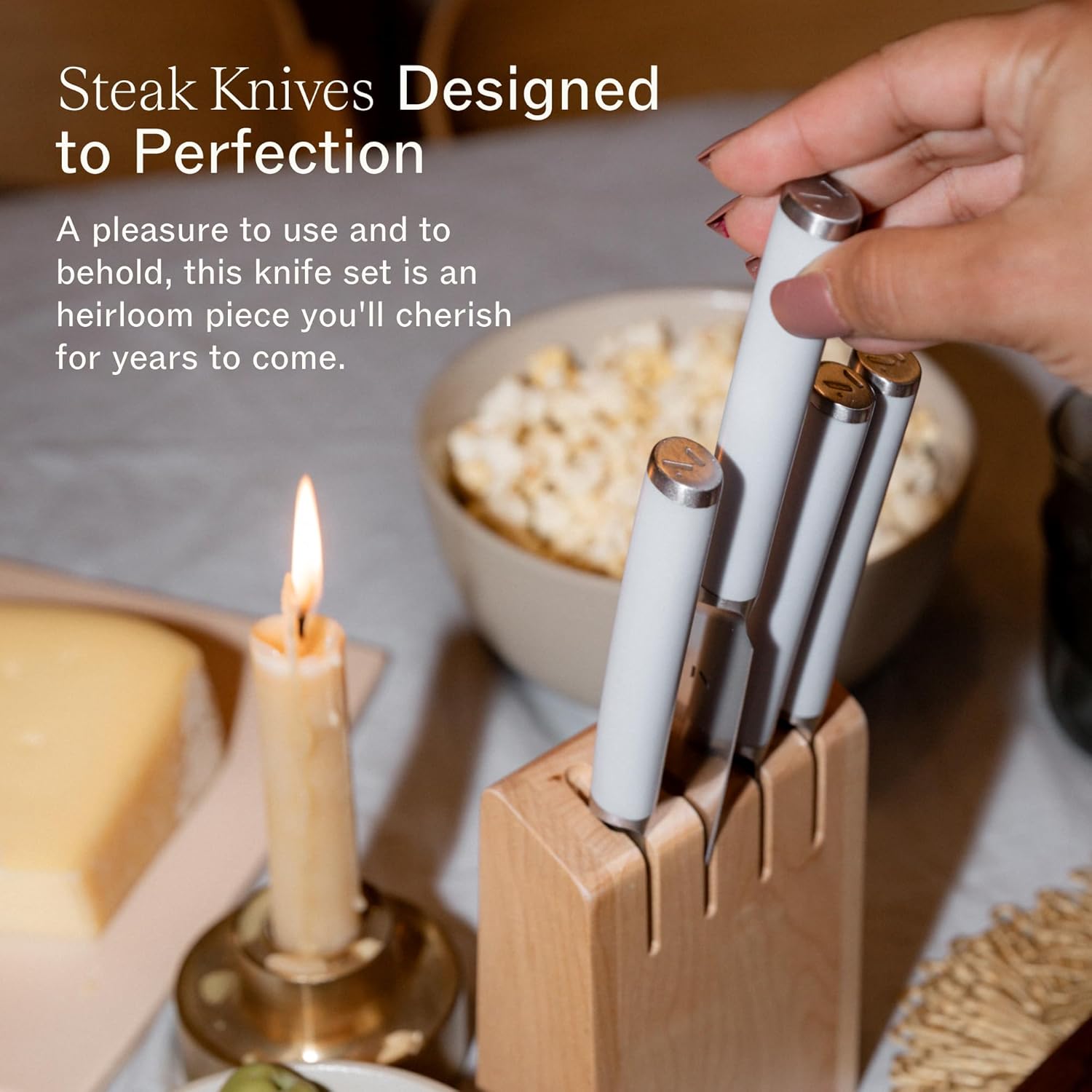 COMFORT MEETS STYLE – Designed with a signature matte, stain-resistant handle that feels just right in your hand, these straight edge steak knives come with a sleek steak knife holder to keep them sharp, safe, and stylishly stored.