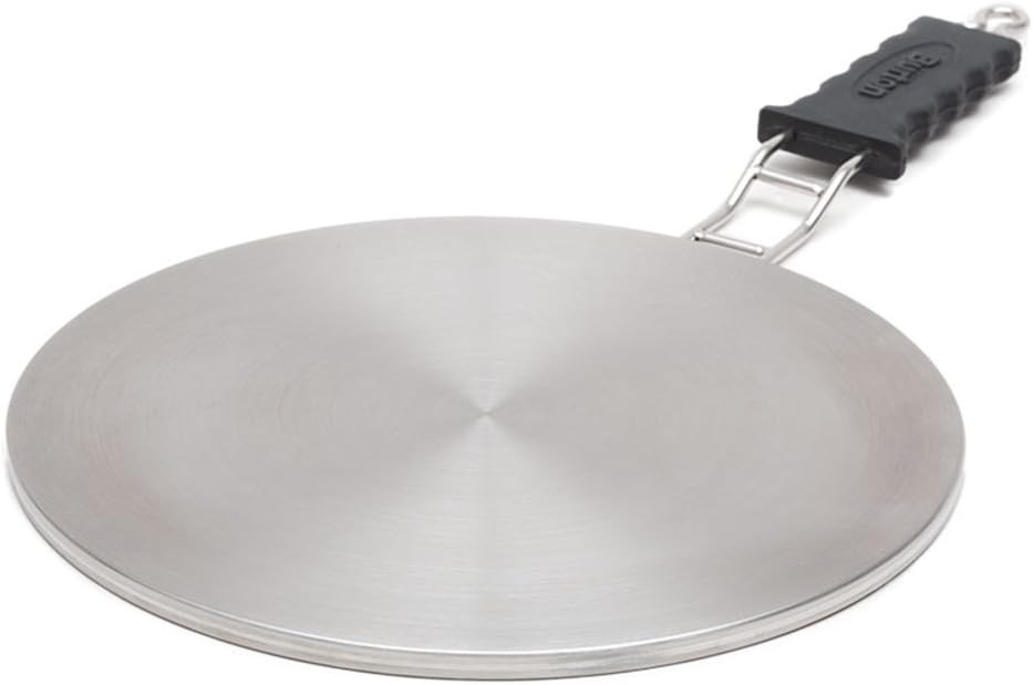 Designed for use with any portable or built-in induction cooktop, this handy 8-inch disk acts as a heat converter, making it possible to cook with any type of cookware including aluminum, glass, copper, porcelain, and non-magnetic stainless steel. Simply place the disk between any induction cooktop and the cookware of choice–anything from small fry pans and saucepans to larger griddles and stockpots–for safe, efficient cooking. The unit’s durable stainless-steel construction evenly distributes heat, while its stay-cool handle ensures a secure, comfortable grip. The induction interface disk measures 8 by 15 by 1/2 inches.