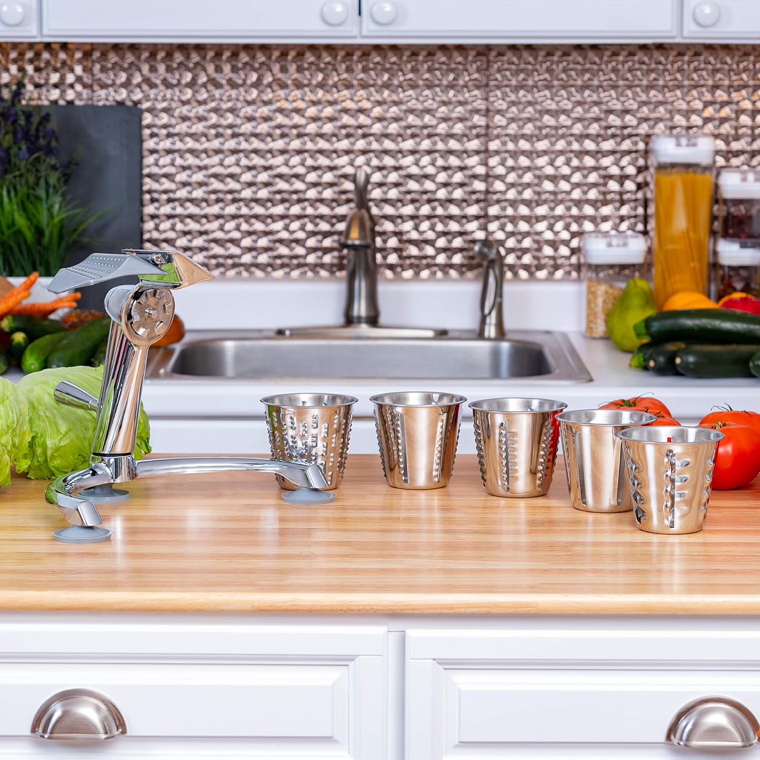Maxam’s Vegetable Chopper is a remarkably powerful kitchen cutting-, shredding-, slicing- and grating-tool that rapidly drops the time it takes to create nutritiously-delicious meals at home! Featuring 5 T-304 stainless-steel shredder, stringer, French-fry-slicer, thin-slicer and waffler cutting cones that slice any culinary creation imaginable, our vegetable chopper is pure meal-prep efficiency personified. Utilizing an elegantly simple circular crank gravity-fed design, our robust vegetable chopper so easily eliminates tiresome knife-cutting sessions that you’ll never want to pay expensive restaurant prices ever again. Employing a protective finger guard to prevent severe cuts, Maxam’s pro vegetable chopper secures firmly to kitchen counters and tabletops via a sturdy suction-cup base—and the cones’ heavy-duty chrome finish is also dishwasher safe! ABOUT: Maxam is a modern household goods producing company that creates innovative kitchen tools and accessories that make it easier and far more enjoyable to prepare healthy nutritious food in your home.