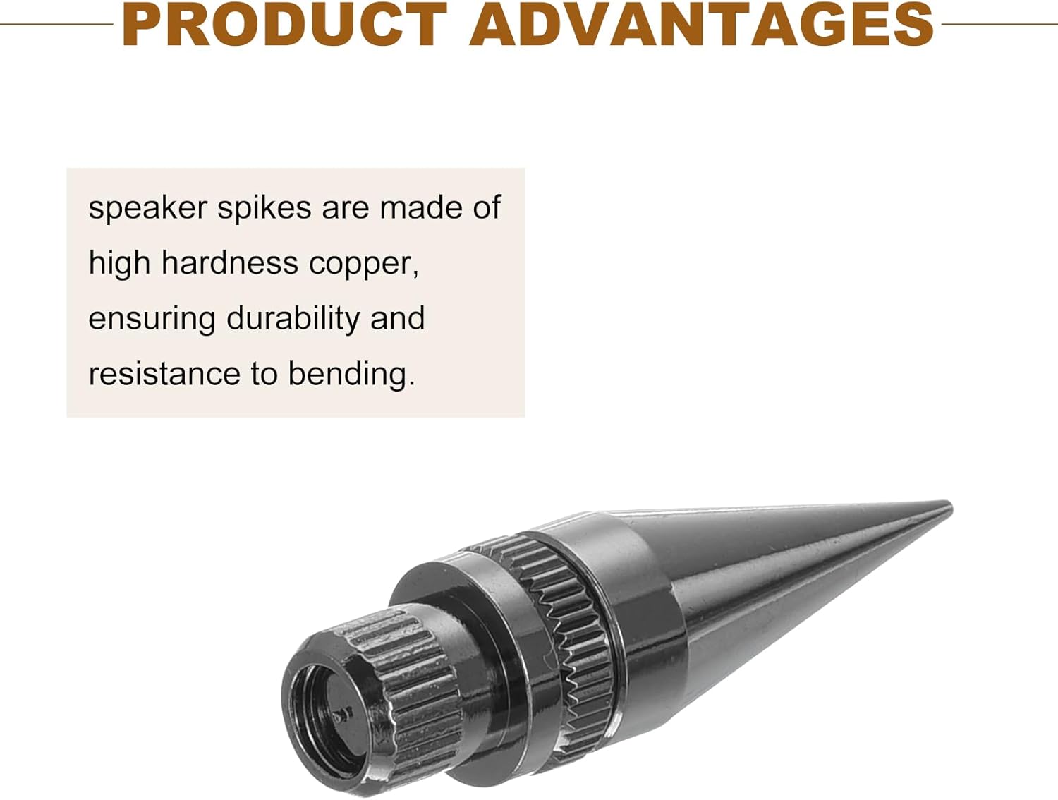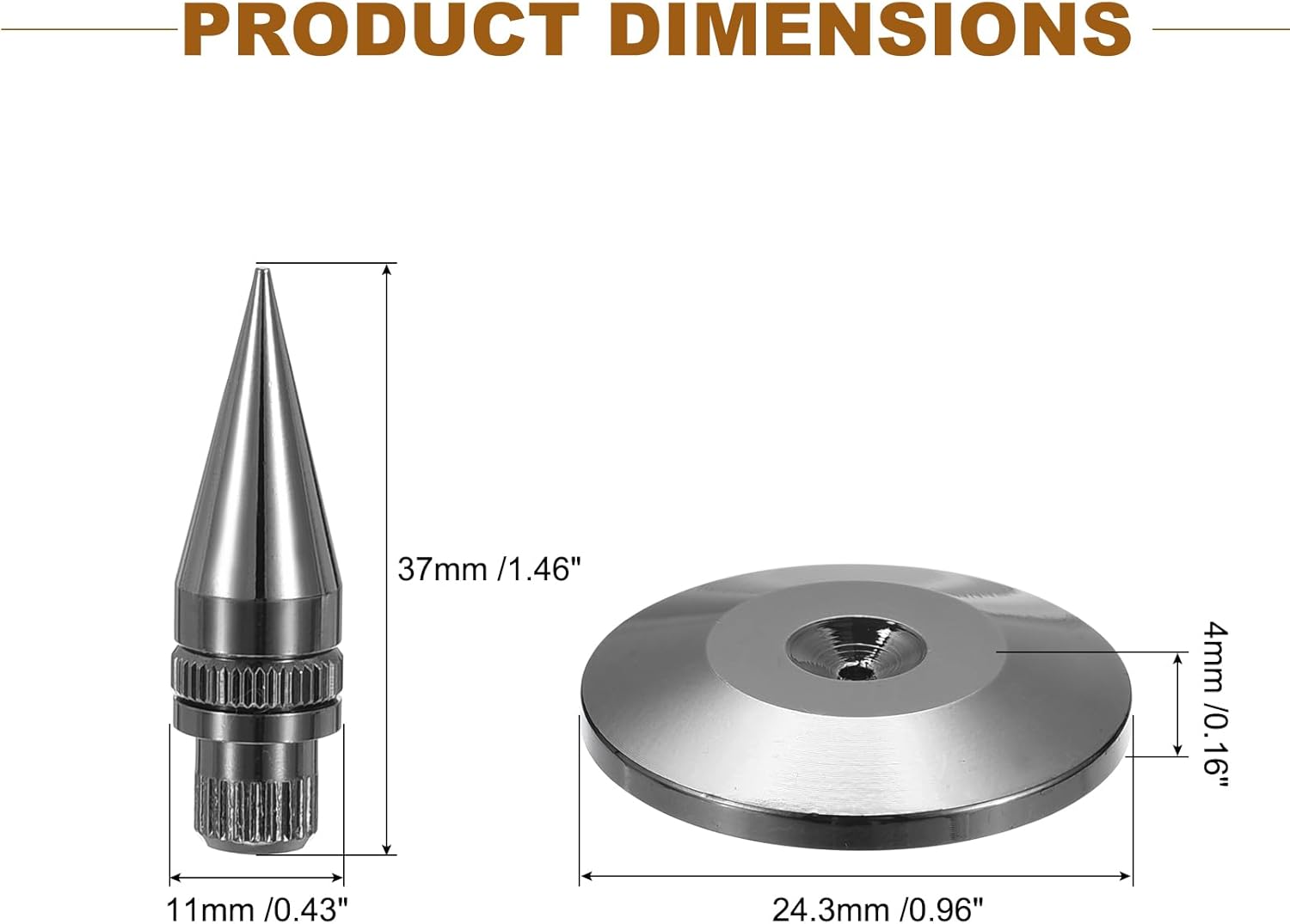 Package contains:4 x speaker spikes and pad mat;Material: copper;Color: black;The base pad size:24.3 x 4 mm/0.96 x 0.16 inch(Diameter x Height);The spikes size:26.7 x 24.6 mm/1.05 x 0.97 inch(Diameter x Height);