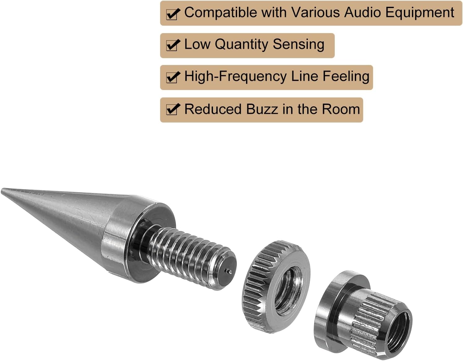Isolation spikes are good for speaker, amplifier, instrument, turntable, CD/DVD player, recorder, and more, as they minimize vibrations, reduce noise in the room,while enhancing low quantity sense and high-frequency line feeling.Placed under the spikes that can be fitted to floor-standing loudspeakers, they can protect hardwood or tile floors from being scratched.