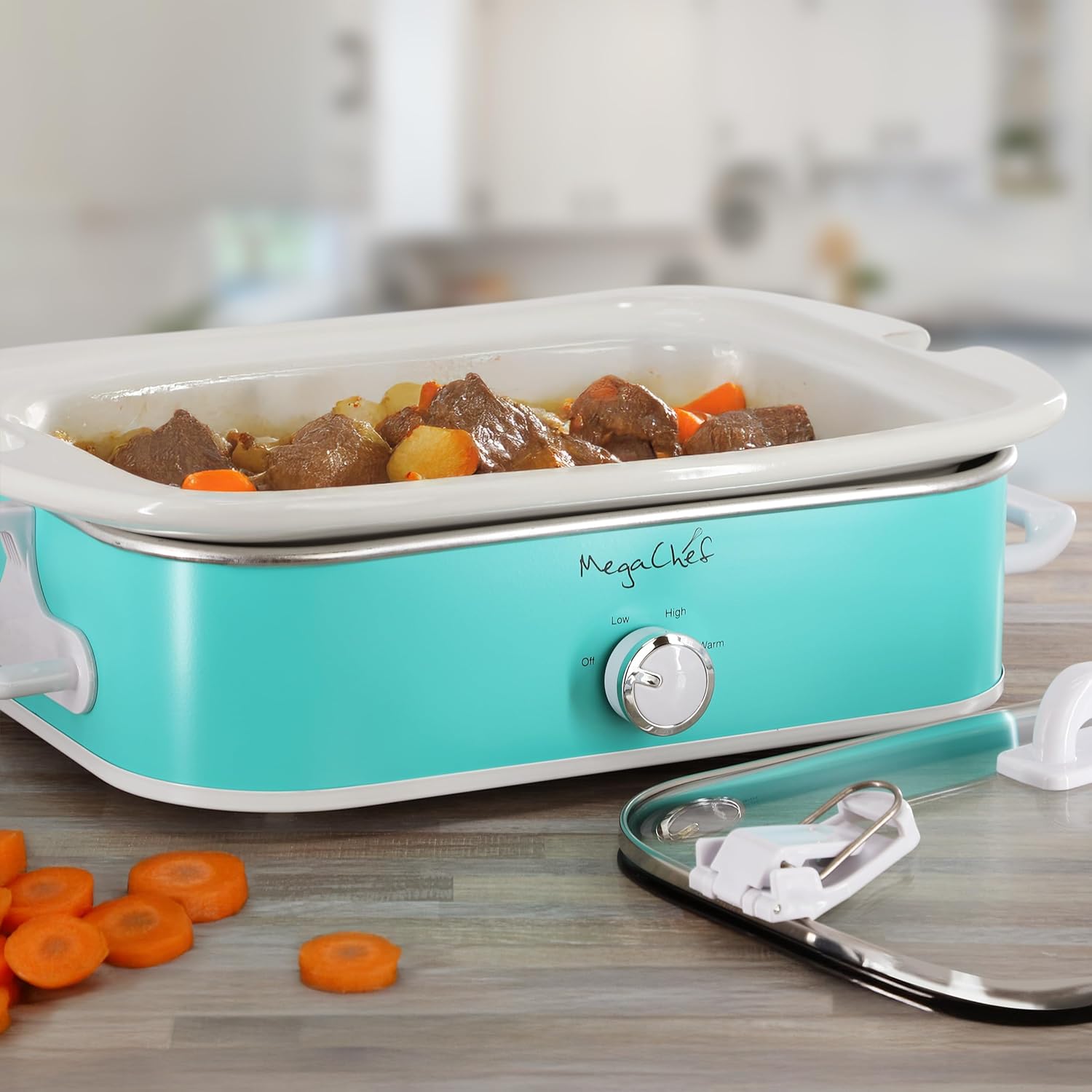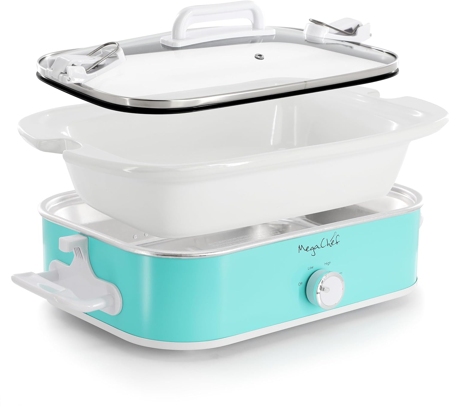 Elevate your cooking experience with the MegaChef Rectangle Slow Cooker, designed for both style and functionality. Crafted from durable stoneware, glass, and metal, this stunning slow cooker boasts a generous 3.5-quart capacity, perfect for preparing delicious meals for family and friends. Featuring convenient low, high, and warm settings, you can easily tailor your cooking to your needs. The latch and hook locking lid system ensures a secure seal, making it perfect for transporting your dishes with confidence. The tempered glass lid allows you to monitor your cooking without releasing heat, while the oven-safe stoneware crock provides versatility in your culinary endeavors. With dishwasher-safe parts, cleanup is a breeze. Operating at 120V and 60Hz, this slow cooker delivers powerful performance with wattage settings of 270W on high, 230W on low, and 150W on warm. Enjoy precise temperature control, with a range of 190-212°F on high, 170-190°F on low, and 145-165°F on warm.