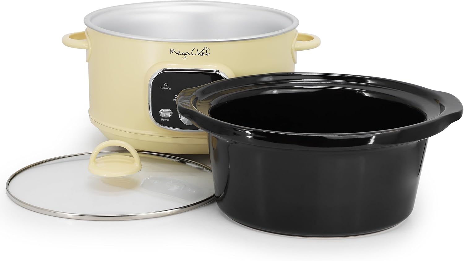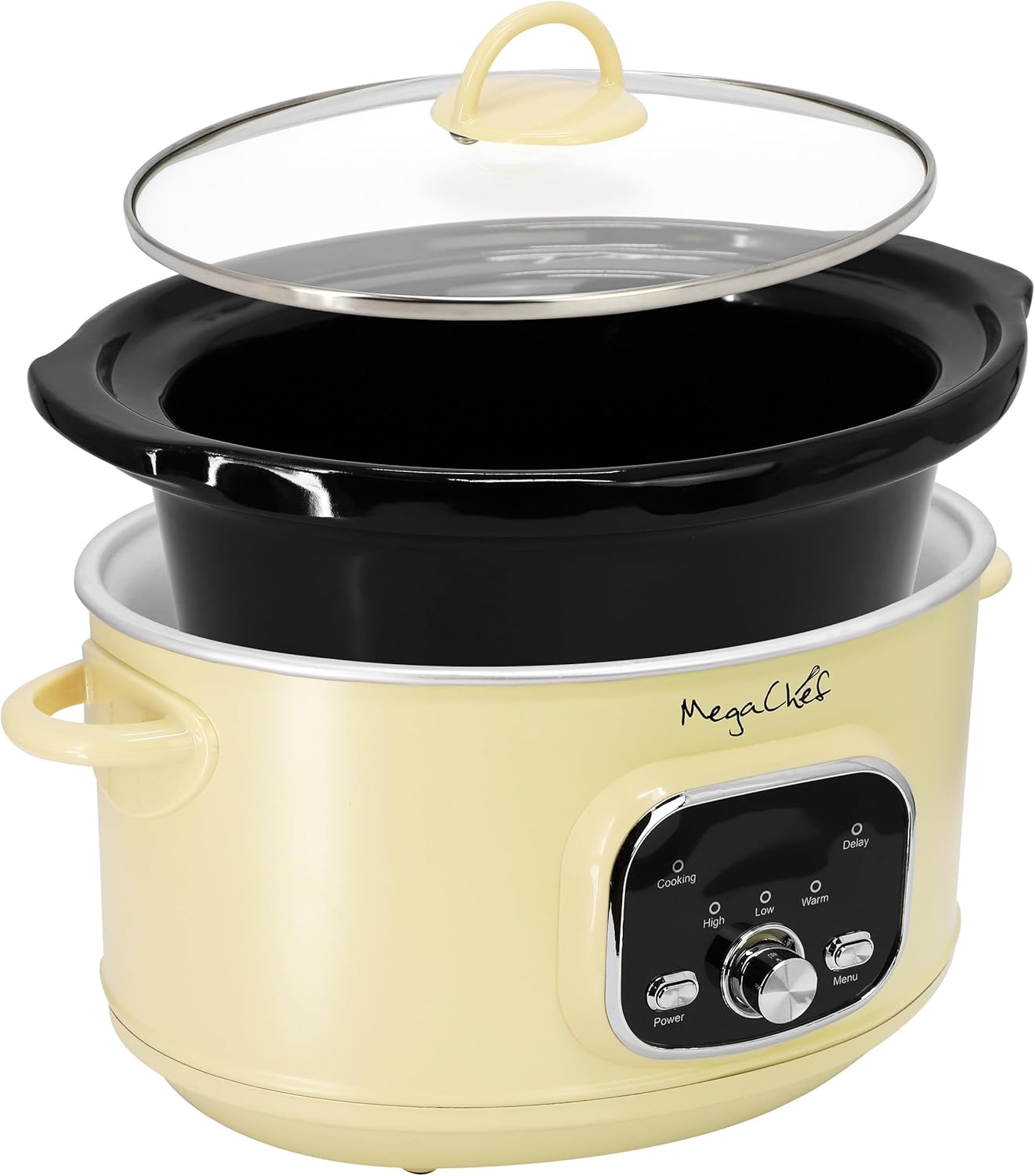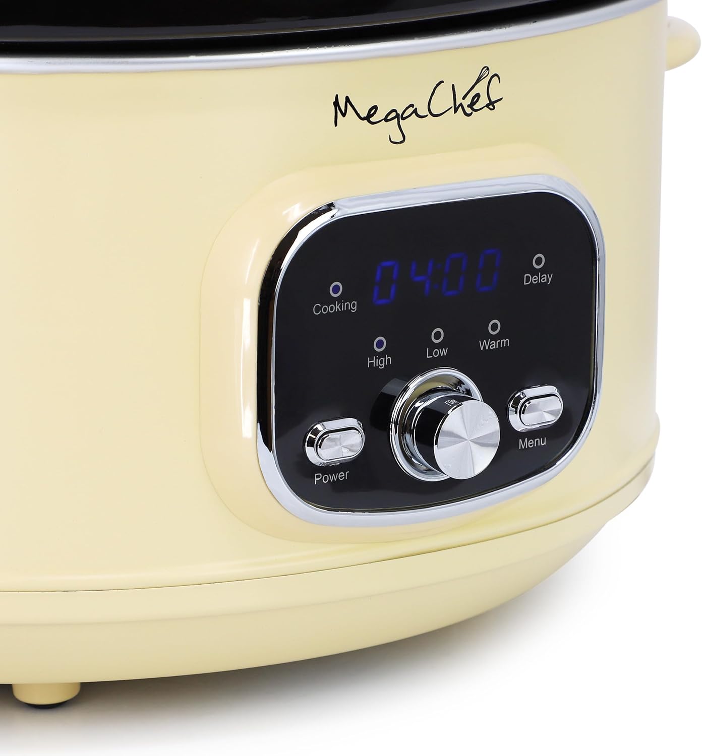Introducing the MegaChef 3.7 Quart Electric Slow Cooker in Ivory, a stylish addition to any kitchen. This appliance features a removable inner oval ceramic pot in a matching Ivory color, complemented by a modern cream-colored outer shell and panel in the same shade. The digital panel, accented with a soothing Blue light, allows for easy control and monitoring of cooking settings, ensuring precise results with every use. For added convenience and safety, cool-touch handles and knobs in cream color provide a secure grip during handling. The tempered clear glass lid lets you keep an eye on your culinary creations without lifting the lid, preserving heat and flavors. A silver chrome panel at the bottom and edges adds durability and a touch of sophistication. Both the lid and ceramic crock of the MegaChef slow cooker are dishwasher safe, simplifying cleanup after meals. This appliance combines functionality with aesthetic appeal. Whether you’re preparing comforting soups, savory stews, or tender roasts, the MegaChef 3.7 Quart Electric Slow Cooker in Ivory is designed to deliver delicious results effortlessly, making it an essential kitchen companion.