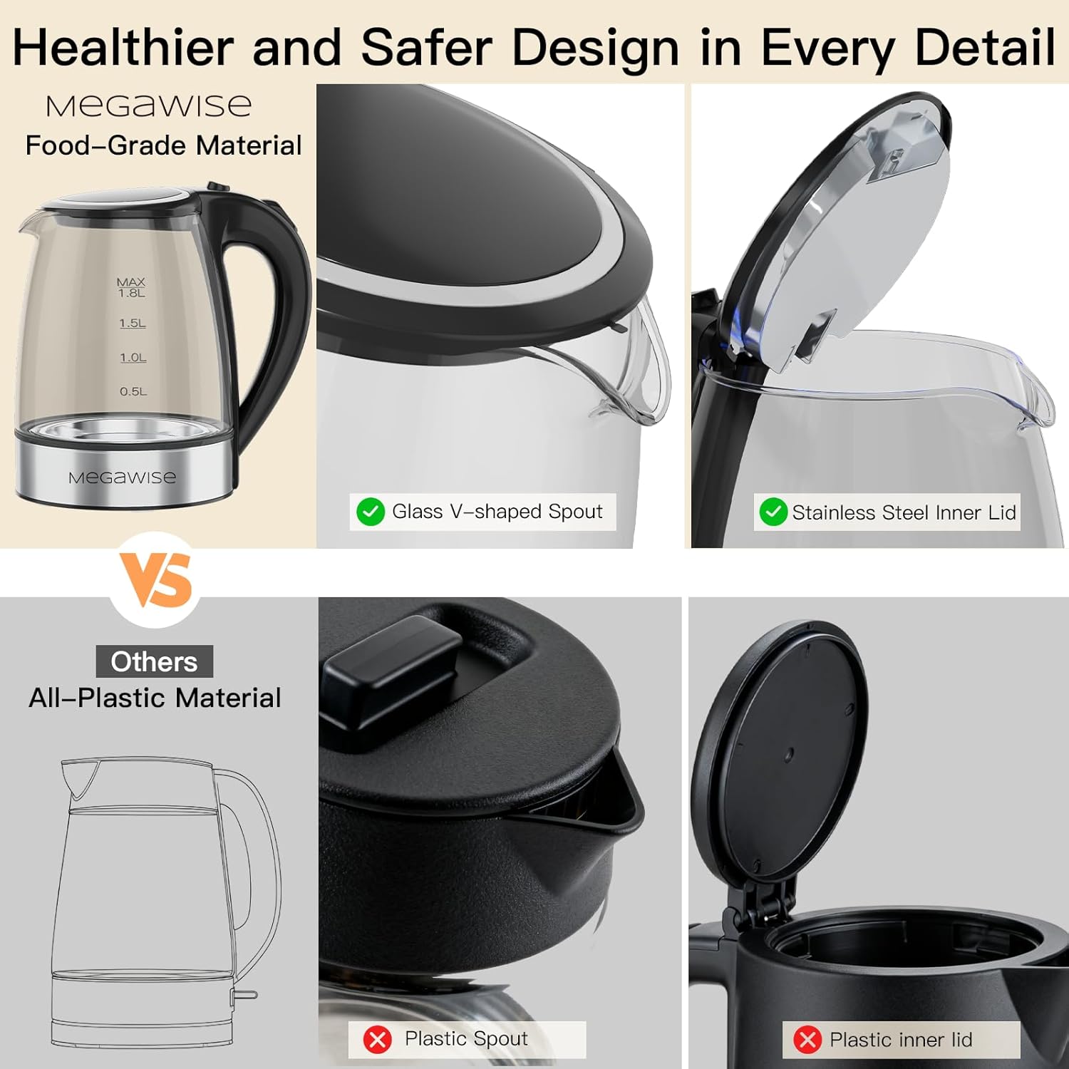 Healthier & Safer Kettle with Auto Shut-Off: Made from high-quality borosilicate glass, this kettle is designed to withstand thermal shock. The inner base and lid are constructed from 304 stainless steel, ensuring no plastic touches the boiling water, keeping your water pure. It automatically shuts off within 20 seconds after boiling, preventing dry burning and ensuring safety, making it safer than stovetop kettles.