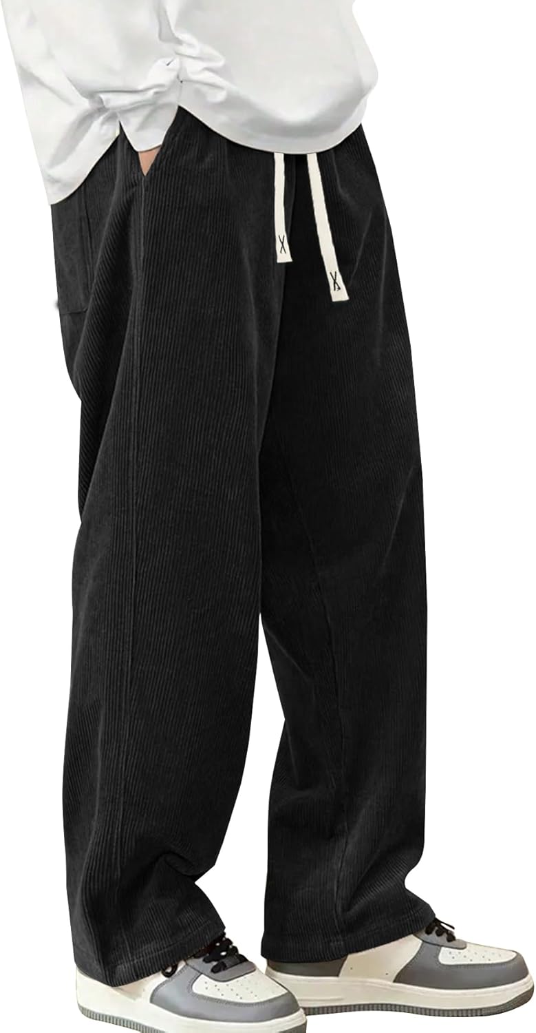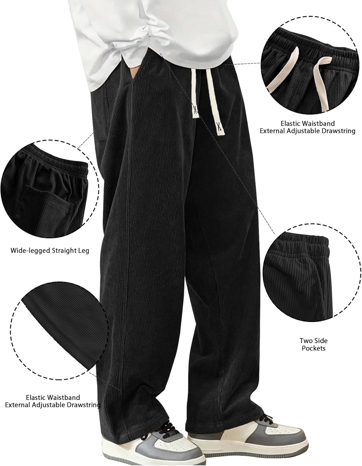 Mens Corduroy Casual Pants Fashion Loose Fit Wide Leg Pants Straight Sweatpants Elastic Waist Drawstring