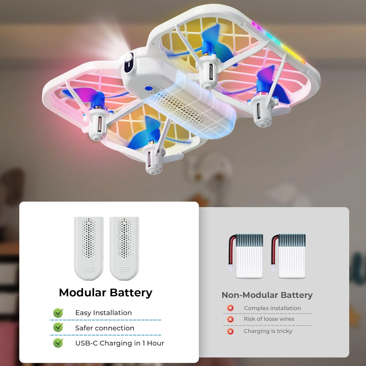 【Five Lights, Endless Fun】Switch between five dazzling light modes to make your night flights shine bright. In two-player racing battles, easily spot and distinguish your mini drone from the competition. This is the perfect kids drone, ideal for gifts for boys 8-12 or boys toys age 8-10.