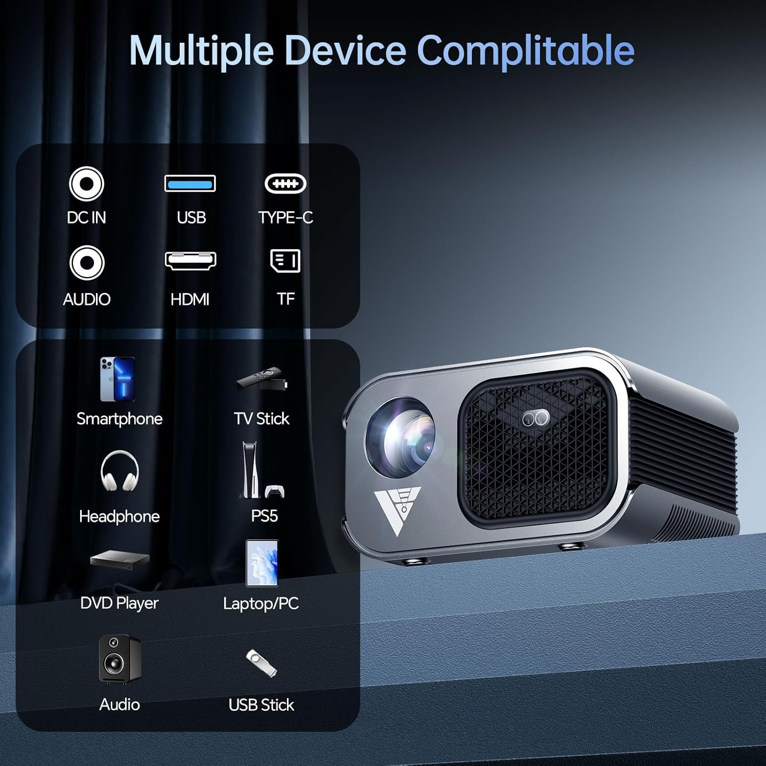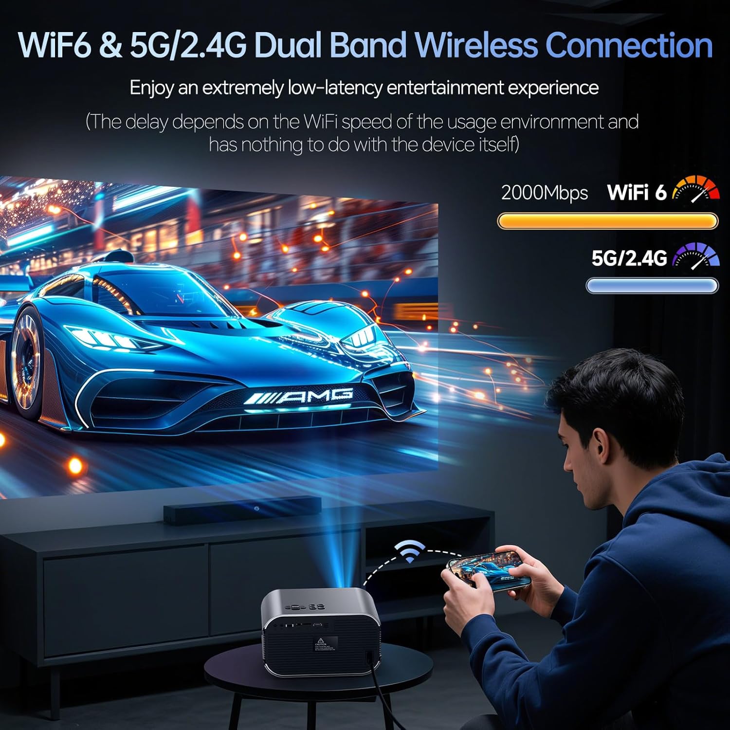 6G WiFi & Bluetooth 5.2: The projector offers a robust and versatile connectivity experience, with faster speeds, reduced interference, and improved audio and picture quality with dual-band 5G/2.4G WiFi. It supports allowing connection to mobile devices as a standalone stereo speaker or pairing with external Bluetooth speakers, headphones & soundbars to enhance audio effects for home projectors. (Note: Bluetooth function supports audio transmission only, not video)