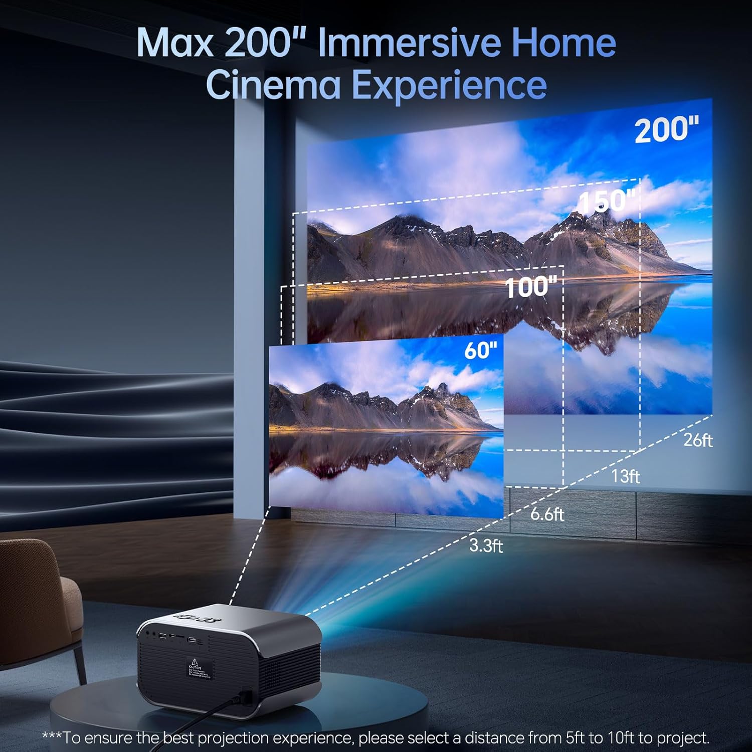 Max 200″ Display, Native 1080P & 4K Supported: Native 1080P resolution provides you with sharp and detailed visuals with full HD quality, perfect for watching movies, playing games, or viewing photos with stunning clarity. Max 200″ display, which can make you enjoy the picture from a suitable distance, just press the focus button on the remote control.