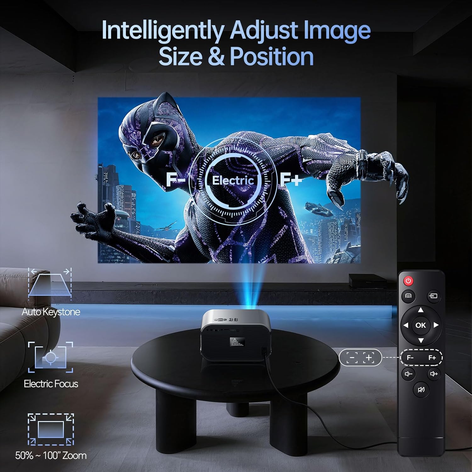 Electric Focus/ Keystone Correction: Enjoy instant focus and crystal-clear images in seconds, just press the remote control seconds without needing to move the movie projector. Plus, it has built-in a 2025 updated super HD lens, so the image always shows vividly and colorfully on the screen, no matter how you position the projector or the size of the projector screen.
