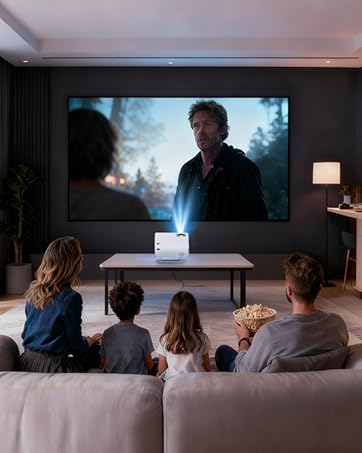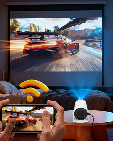 【Dual Intelligent Correction & HiFi Sound Quality】Mini projector upgraded 5W Soundbase speakers, six-way auto keystone correction, TOF laser focus, 0.8 seconds flat screen. Bluetooth projector built-in DSP audio processor, 360° surround sound field is 25% larger than the previous generation, new night cinema mode intelligently adjusts the sound pressure, perfect for late-night viewing.