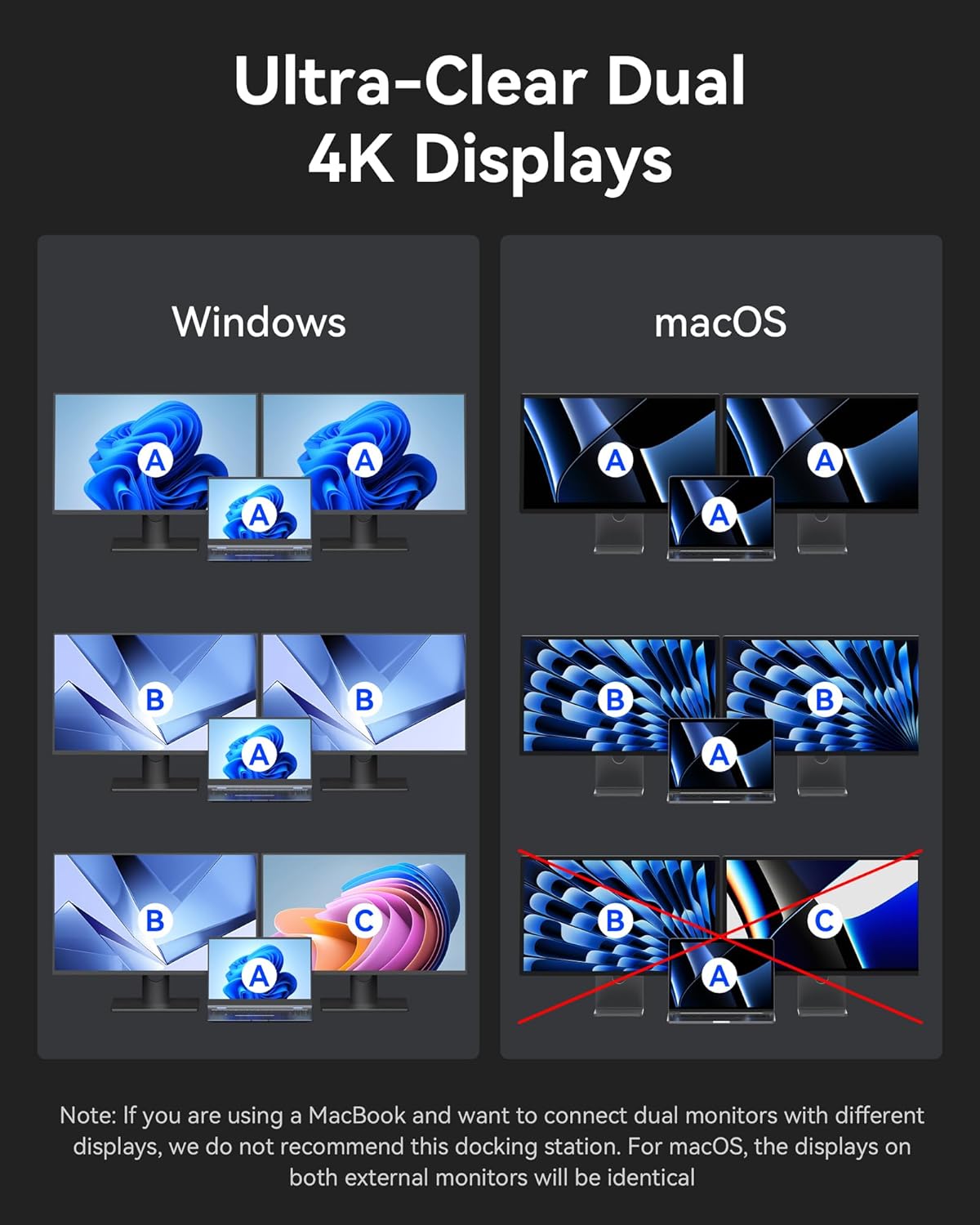 Efficient Dual Display for Windows : Docking station 2 monitors extending your display in stunning 4K resolution through its HDMI and DisplayPort ports, ehancing efficient multitasking. Our laptop dock enhances your work with professional-grade visual capabilities. *Note: MacOS systems do not support dual-display mode, only can extend one display with connected monitors under the extension mode