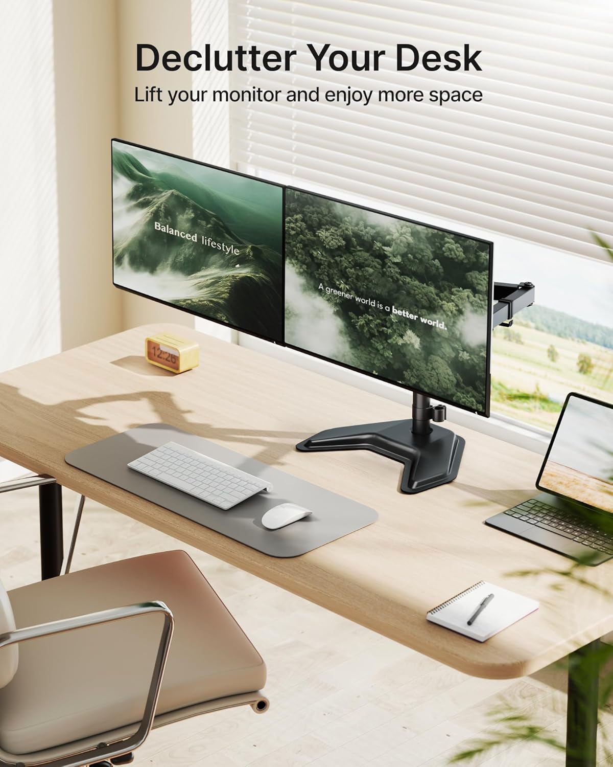monTEK Stable Freestanding Dual Monitor Stand for 17–32” Computer Screens, Heavy-Duty Desk Mount with 22 lbs per Arm, Fully Adjustable Brackets and Arms, Solid V-Shaped Base, VESA 100×100mm Max
