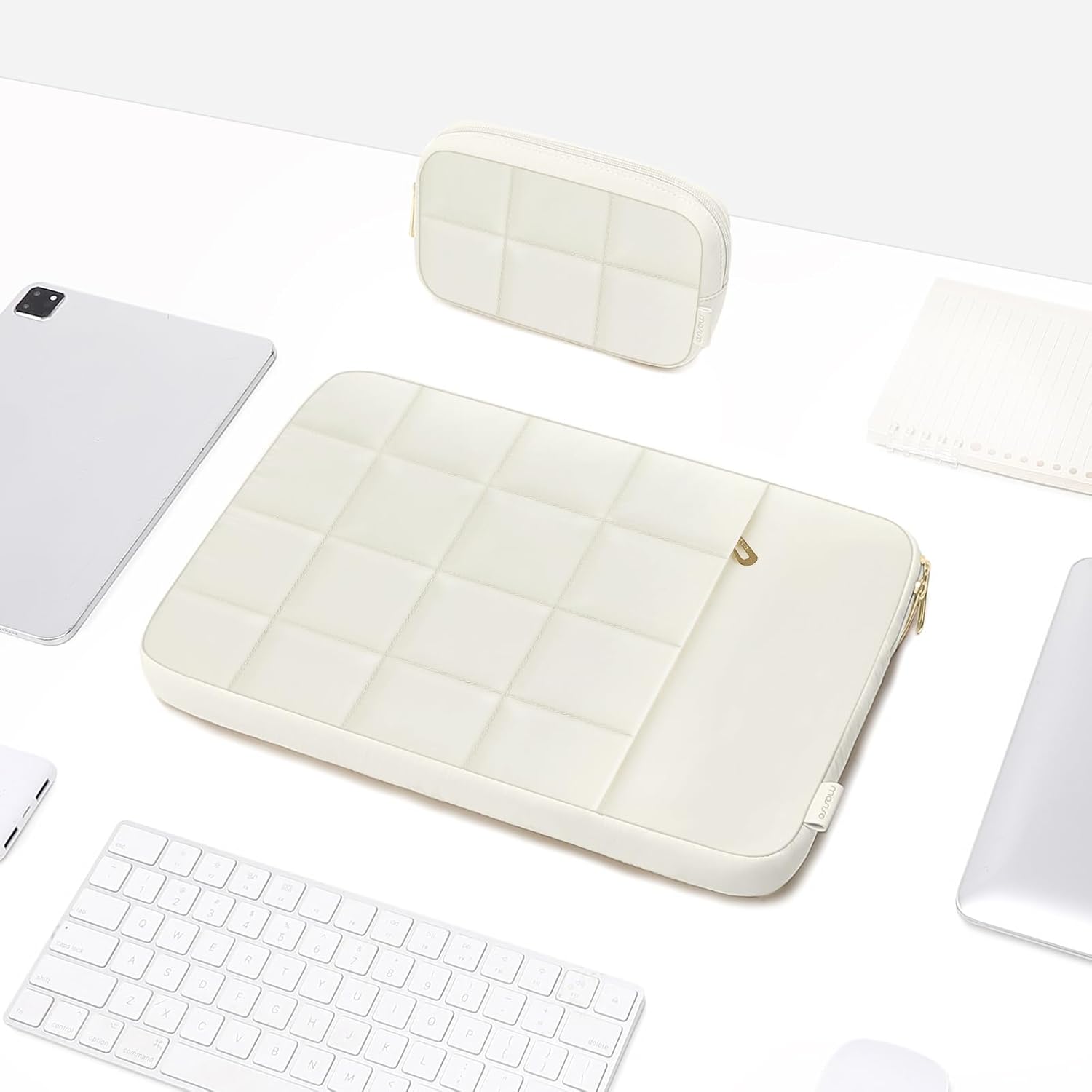 Made with square quilted puffy polyester material, features a polyester foam padding layer and fluffy fleece fabric lining. Protect your laptop from bump, shock and accidental scratches.