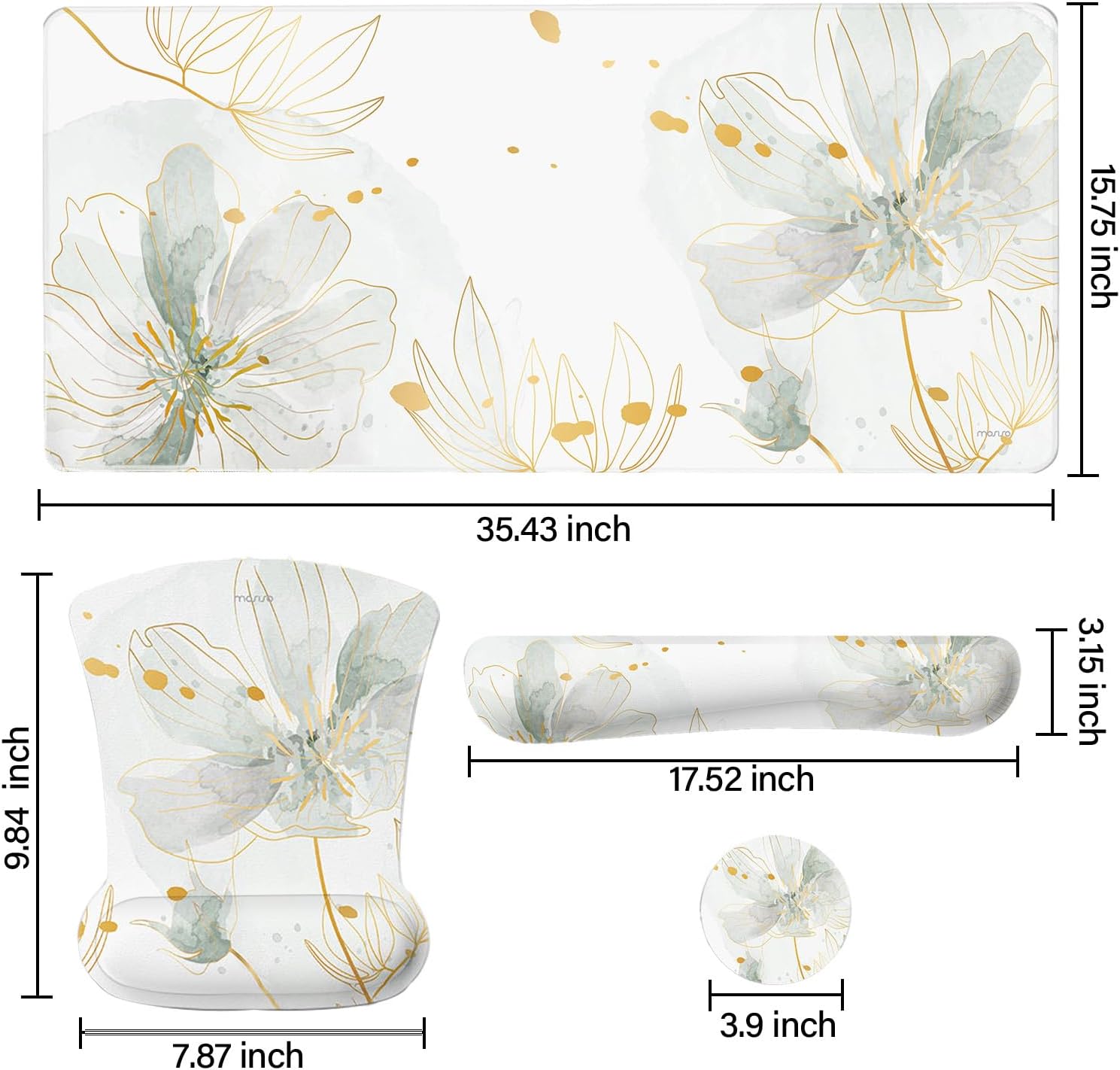 Dimension of large gaming mouse pad: 35.43 x 15.75 inch; dimension of keyboard wrist rest: 17.52 x 3.15 inch; dimension of mouse wrist rest support: 9.84 x 7.87 inch; dimension of coaster: 3.9 inch (diameter). Fits all mouse/keyboard. Compatible with MacBook / Notebook / Chromebook / Ultrabook / Desktop / PC, also compatible with iMac.