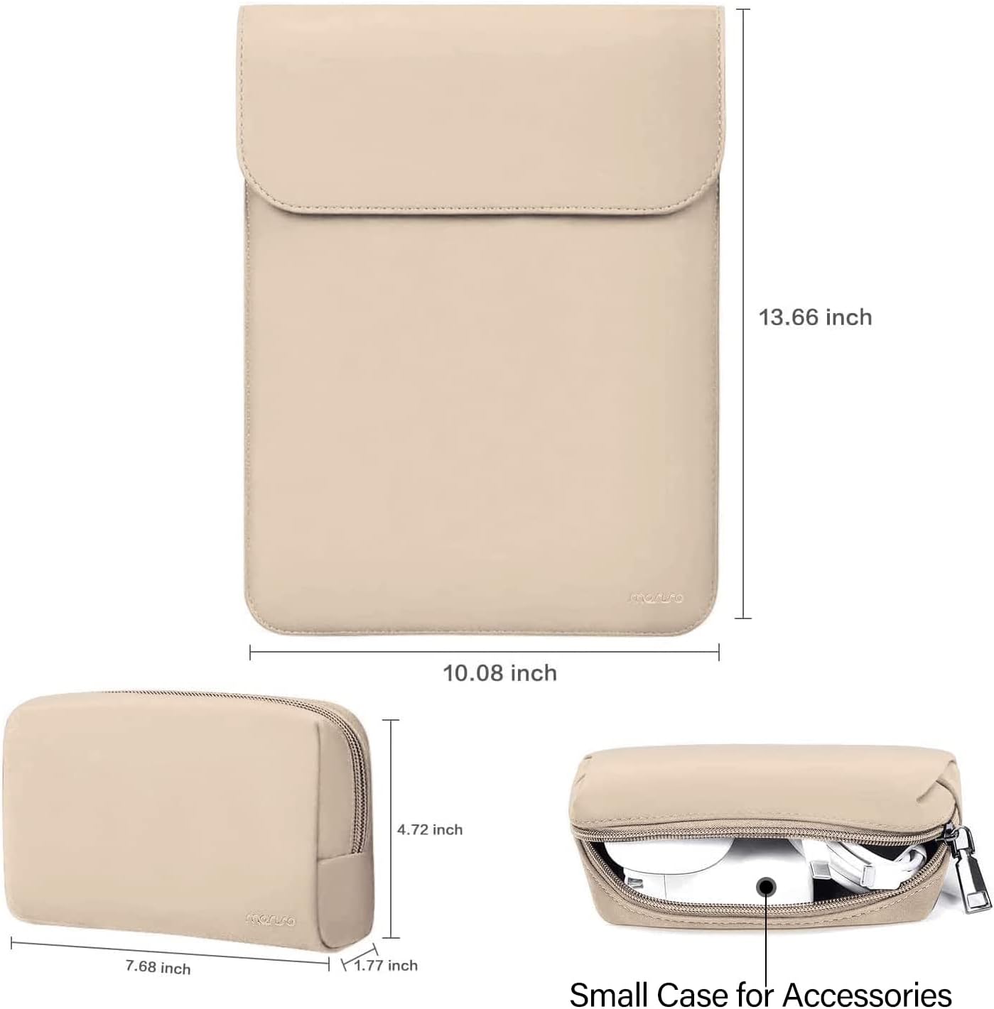 Dimension of the large laptop sleeve is 13.66 x 10.08 inch (L x W); dimension of the small accessory case is 7.68 x 4.72 x 1.77 inch (L x W).
