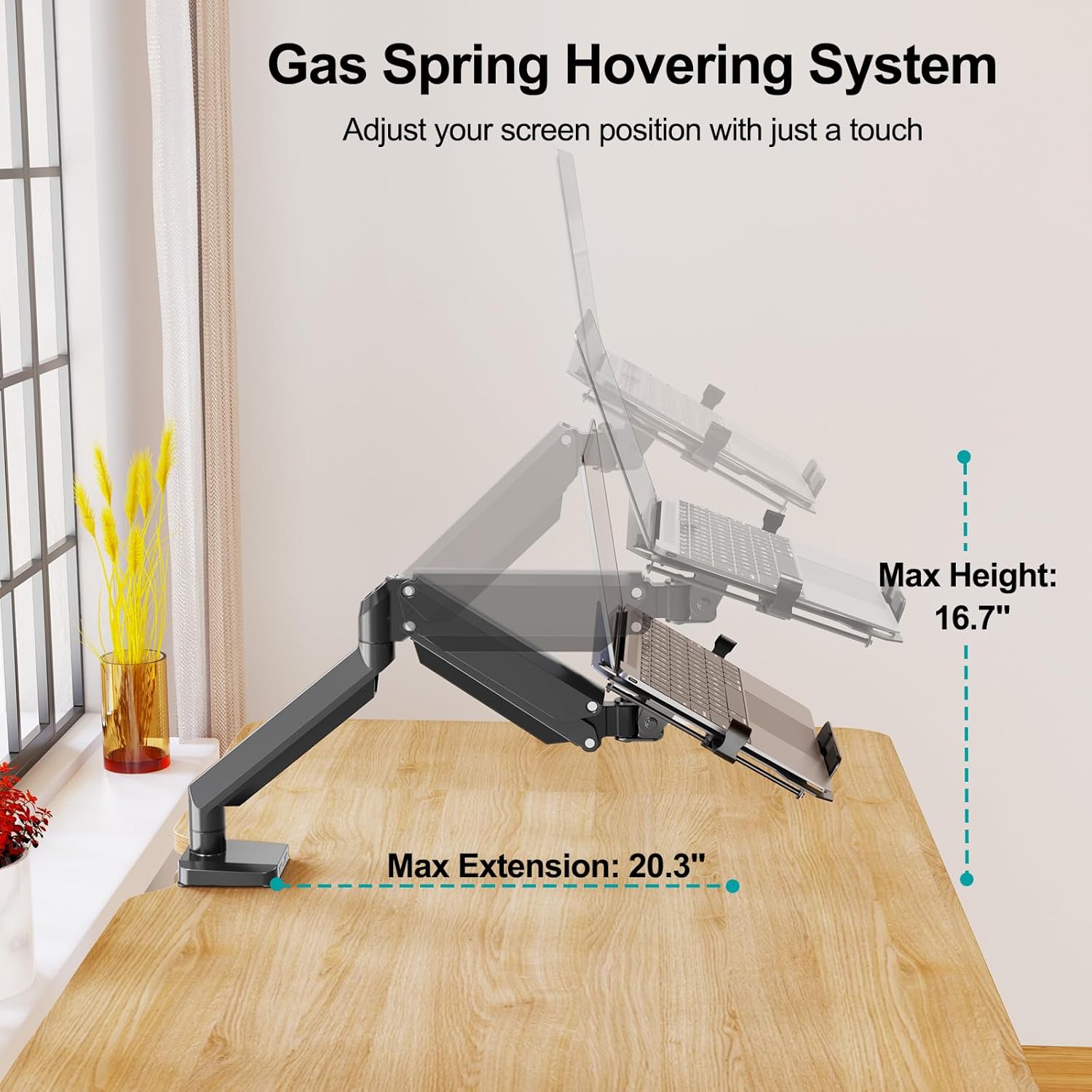 Full Motion Adjustable Laptop Mount – The laptop arm mount offers -45° to +90° tilt, 180°swivel, 360° rotation, and adjustable height up to 16.7″. The maximum extension length is 20.3″. With this laptop mount, you can achieve the perfect ergonomic posture and elevate your productivity.
