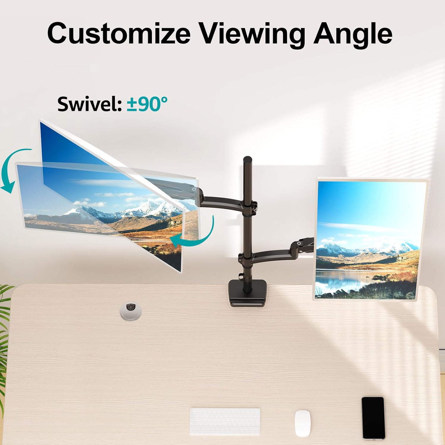 Customize Your Screen Angle – Our vertical monitor mount offers a variety of angles to adjust your screens. It can tilt 90° up and down for the ideal angle and rotates 360° for easy switching between portrait and landscape mode. The swivel ±90° adjustment function on horizontal orientation allows you to watch monitor from different seat positions. You’ll have the flexibility to adjust your viewing experience to your liking.