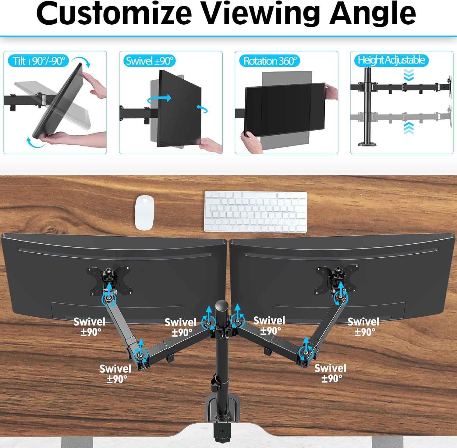 Fully Adjustable Monitor Stand: Each arm is fully and independently adjustable. The monitors can be rotated 360° for landscape or portrait orientation. You can freely adjust height along the center pole, tilt +90°/-90° and swivel 180° to find the right viewing angle and optimal ergonomic position.